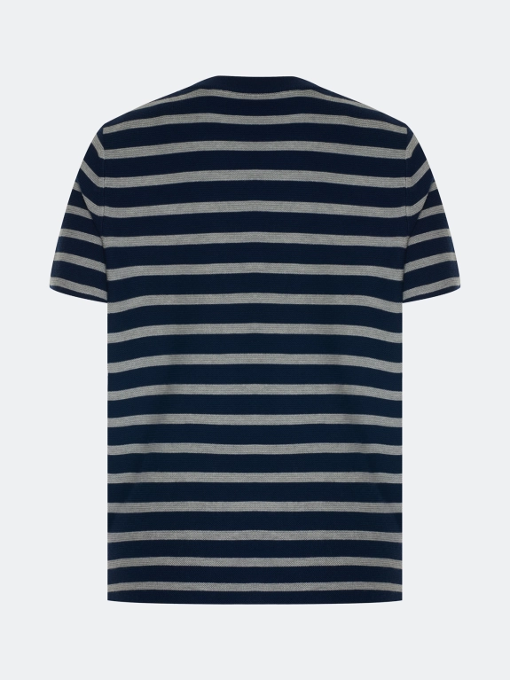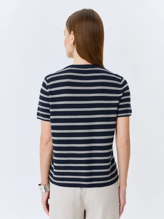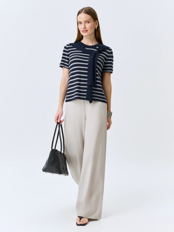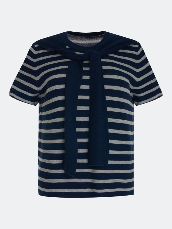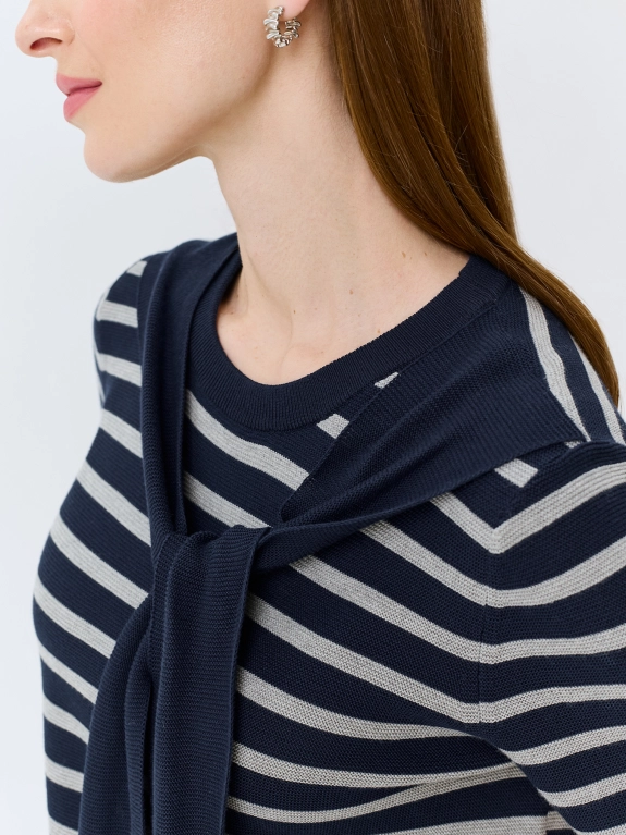 Джемпер из мягкого модала и хлопка в контрастную полоску. Прямой силуэт. Круглый вырез. Короткие втачные рукава. Дополнен имитацией тонкого шарфа.