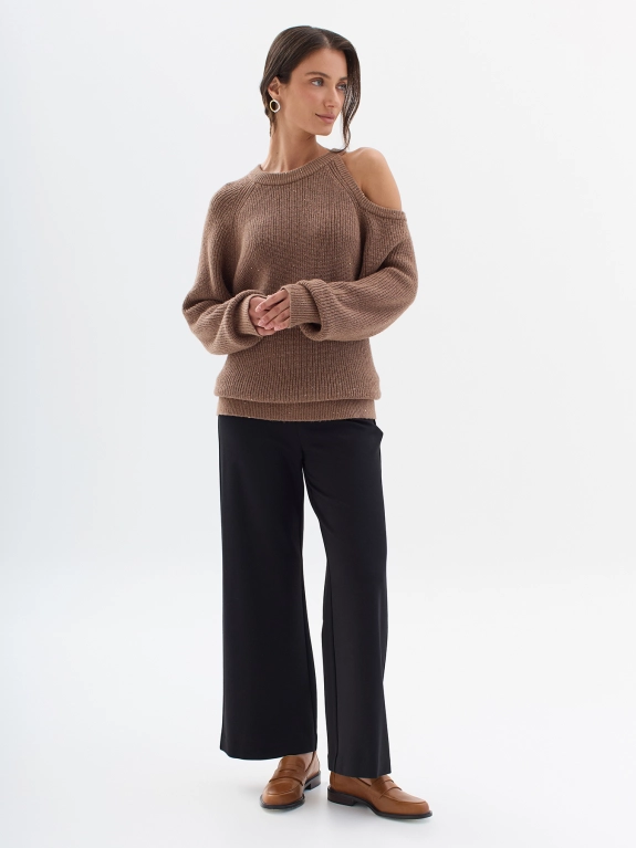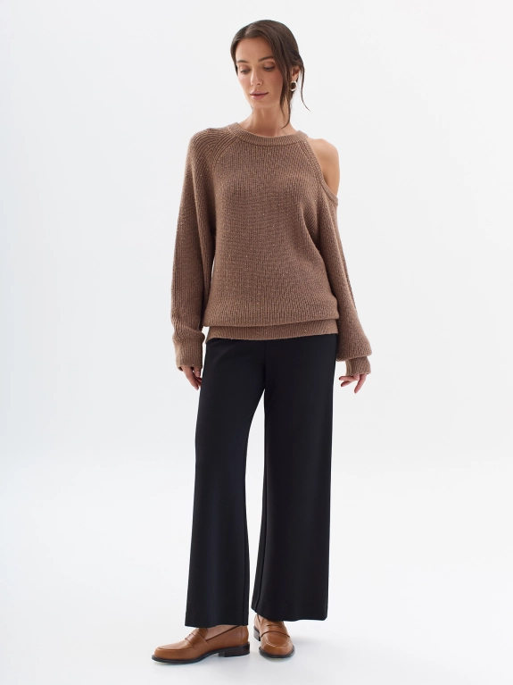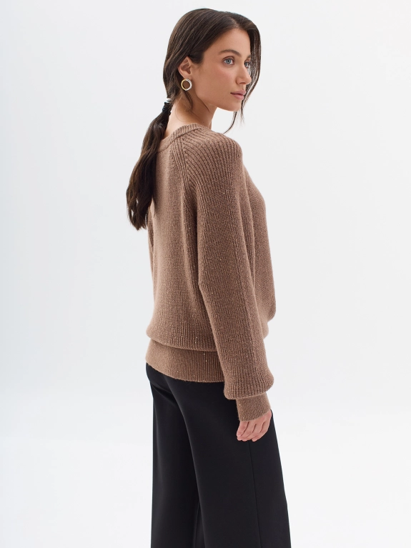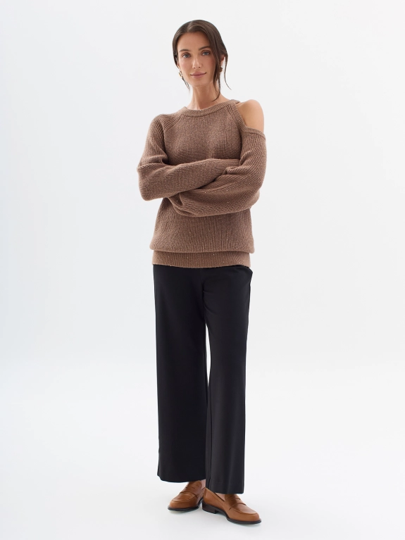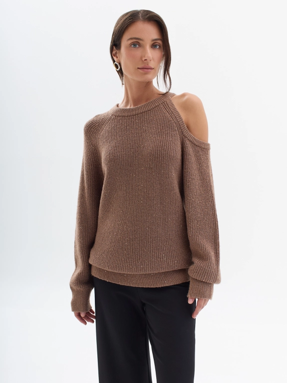 Фантазийный свитер с открытым плечом и кашемиром в составе. Круглый вырез. Прямой силуэт. Деликатные пайетки.