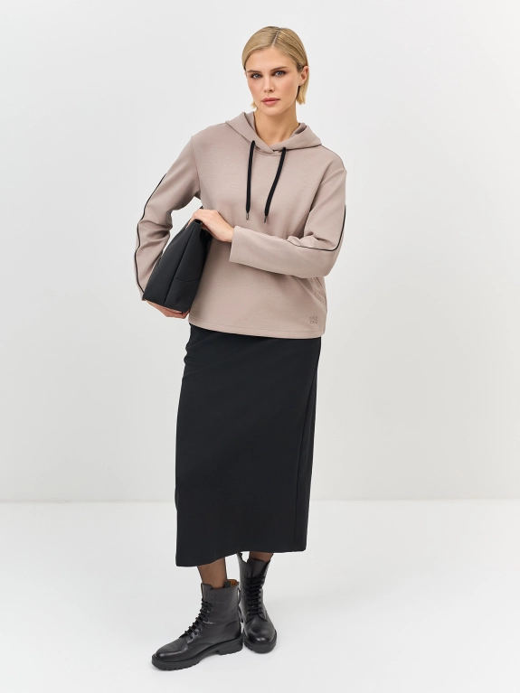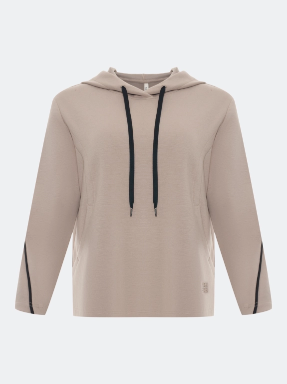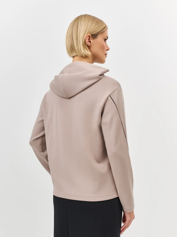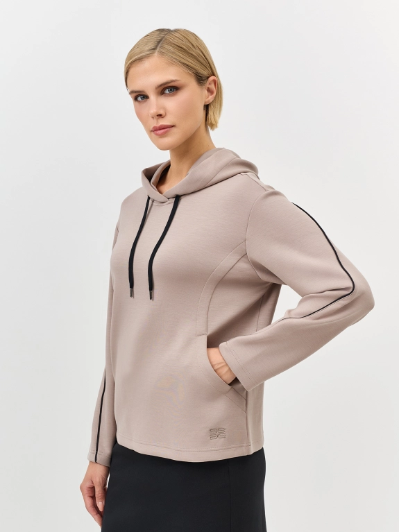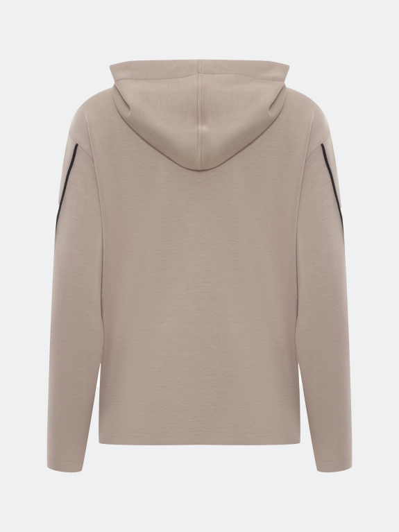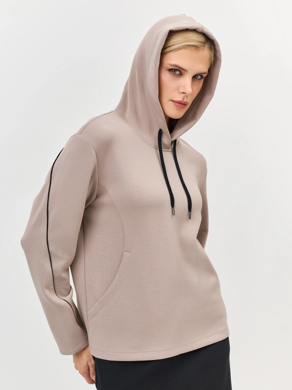 Худи из мягкого модала с контрастными кантами. Свободный силуэт. Воротник с капюшоном с кулисой и контрастным шнуром. Спущенная линия плеч. Боковые карманы в швах.