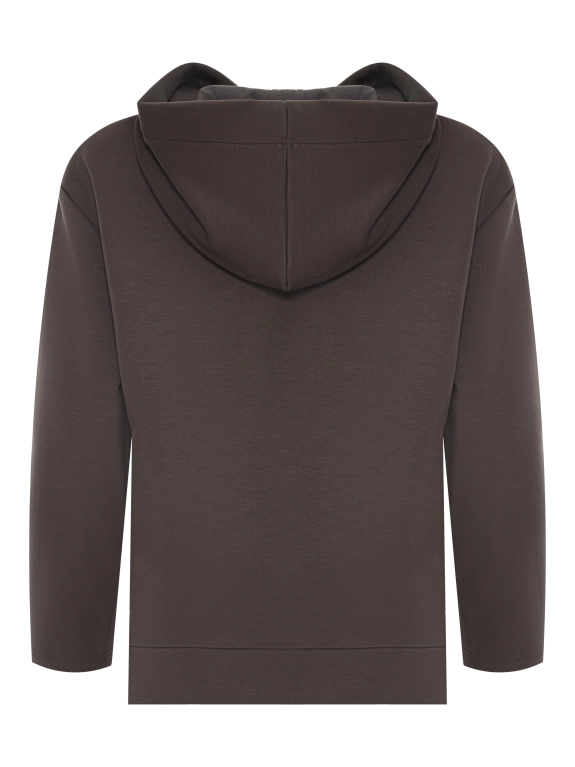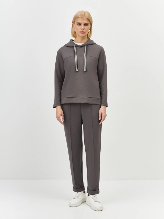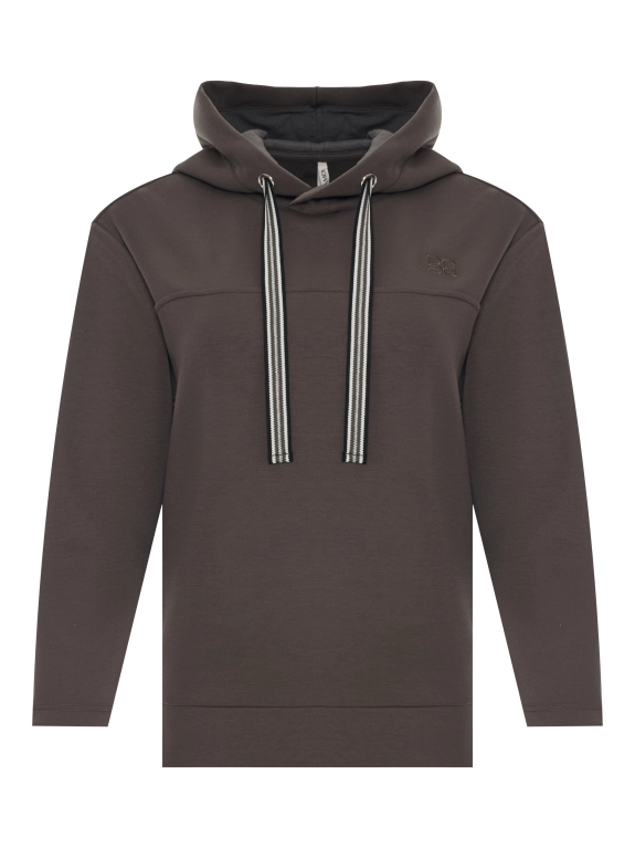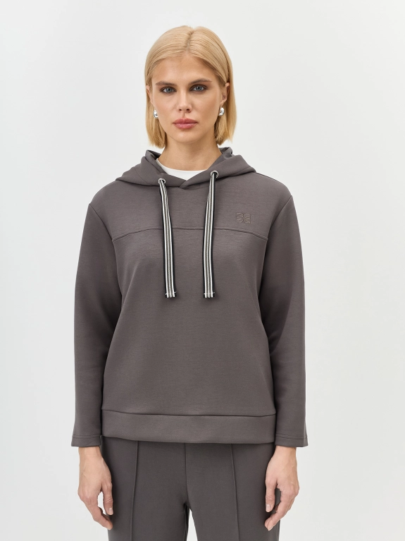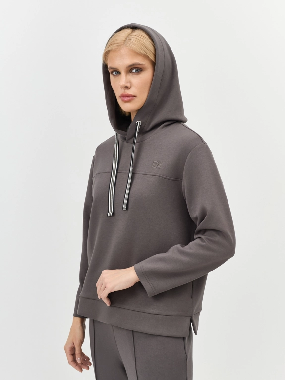Худи из смесового модала свободного силуэта. Капюшон с кулиской и контрастной лентой. Длинные рукава со спущенной линией плеча. Деликатная вышивка в цвет. Комплект с арт. 5257803