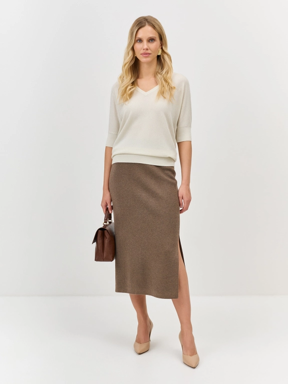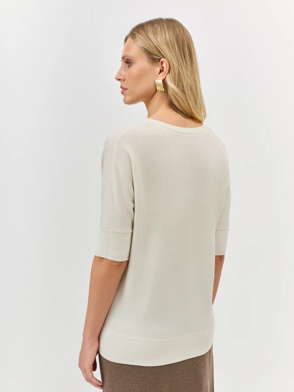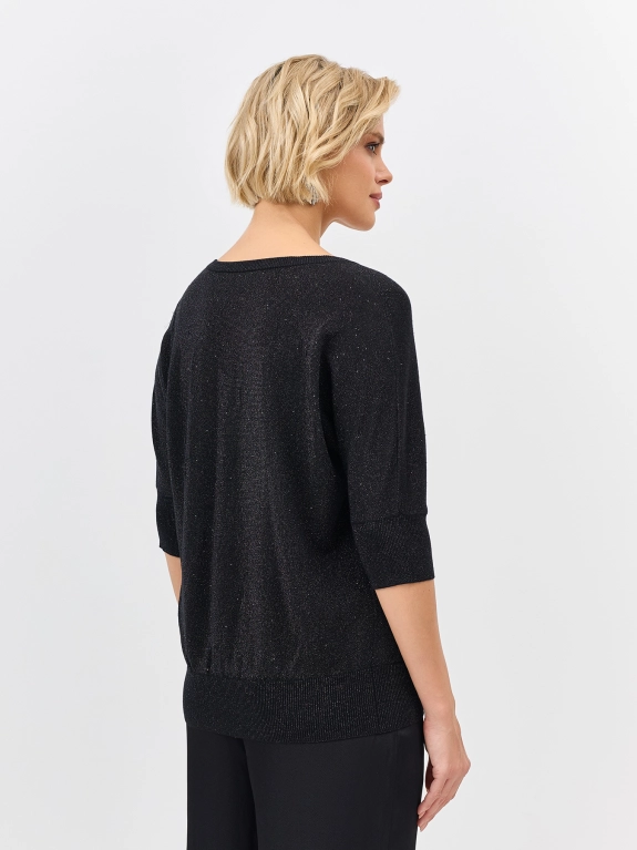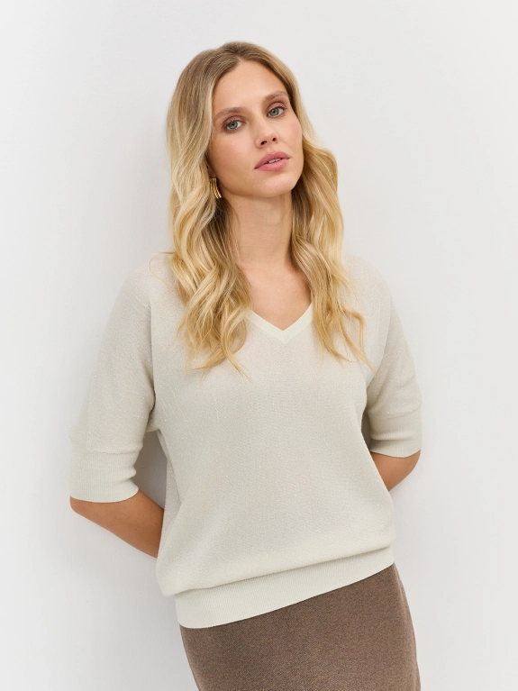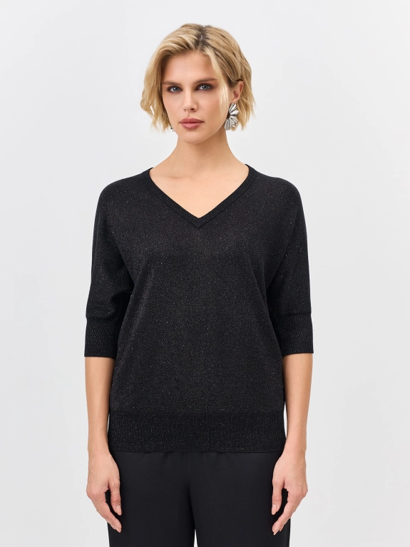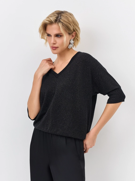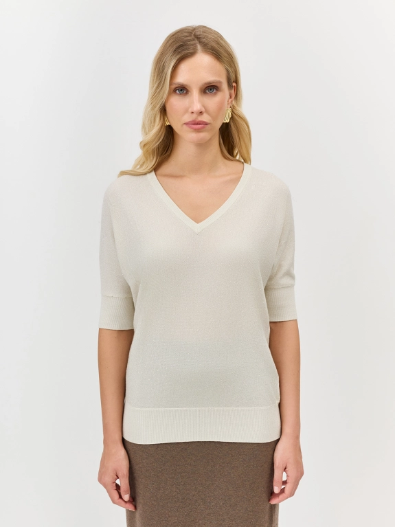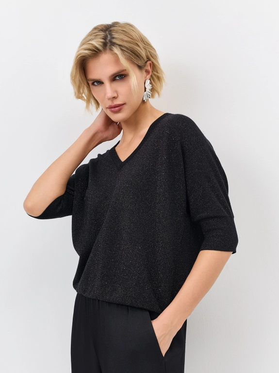 Свободный мерцающий джемпер с шелком и шерстью в составе. Свободный силуэт. V-образный вырез. Спущенная линия плеч. Широкие манжеты по низу рукавов и изделия.