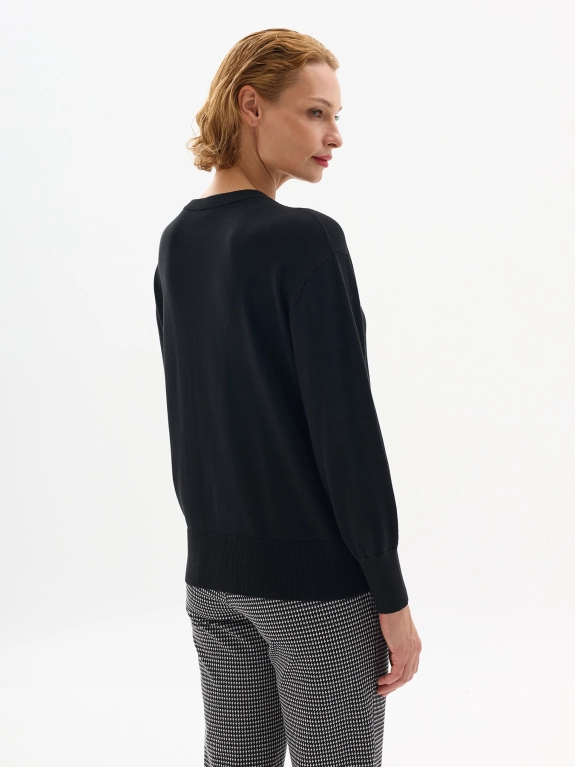 Нарядный джемпер со стразами. В составе модал и хлопок. Круглый вырез. Спущенное плечо. Прямой силуэт.