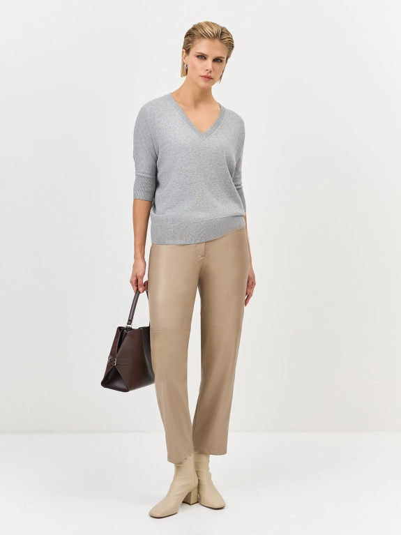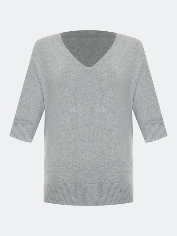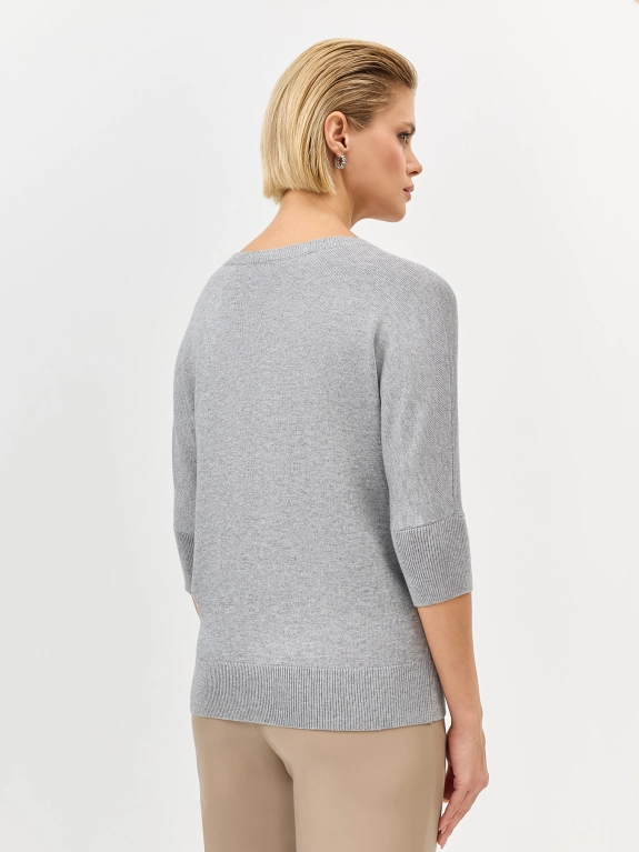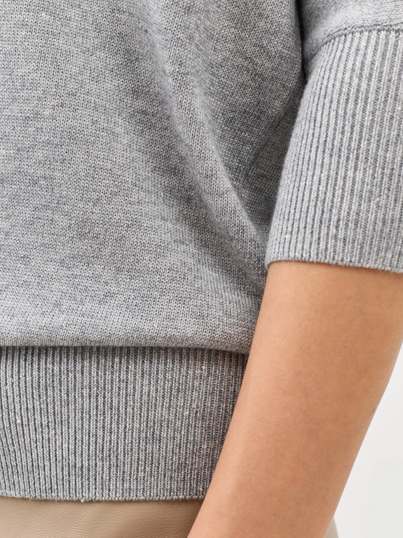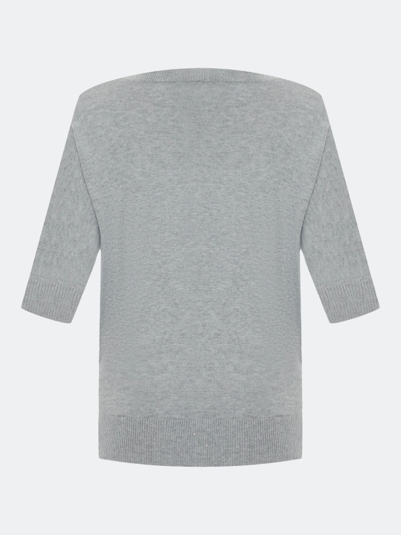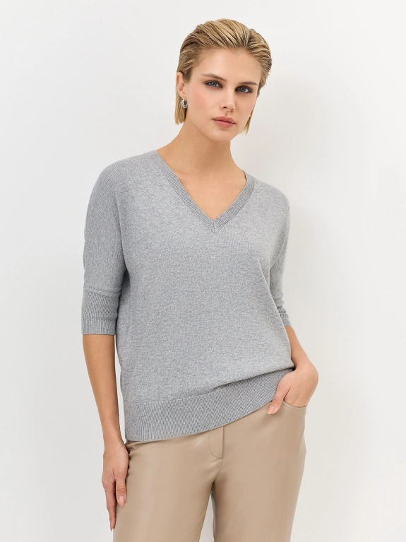 Серебристый джемпер с шелком и шерстью в составе. Свободный силуэт. Спущенная линия плеч. V-образный вырез. Укороченные рукава с манжетами по низу. Дополнен деликатными пайетками.