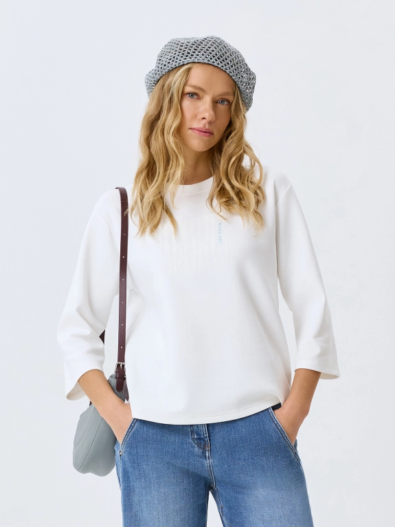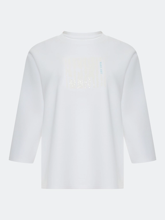 Трикотажный Oversize джемпер с укороченными рукавами 3/4. Свободный силуэт. Линия плеч немного спущена. Круглый вырез. Дополнен мерцающей вышивкой. В составе хлопок и модал.