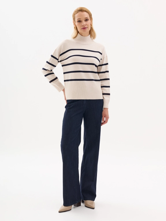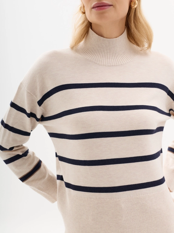 Свитер в контрастную полоску с шерстью. Воротник стойка. Спущенное плечо. Прямой силуэт.