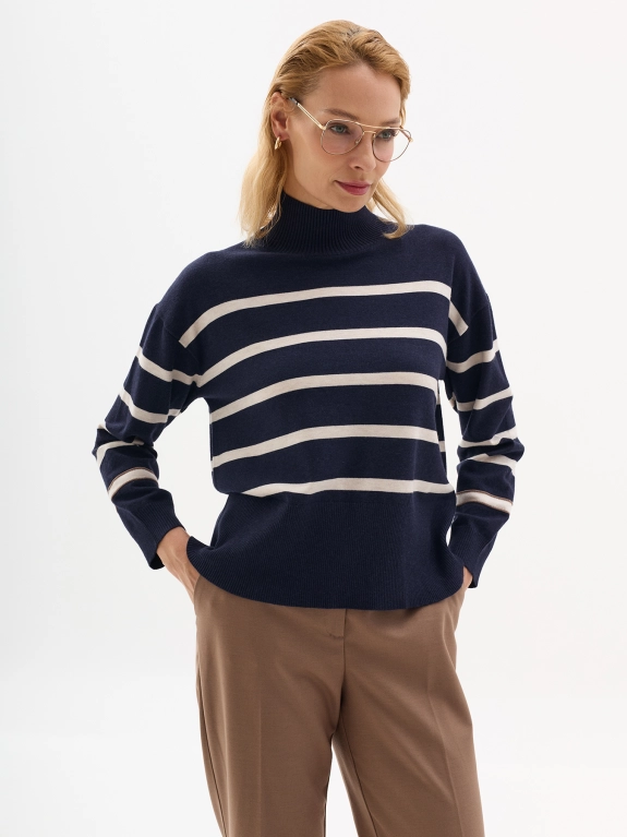 Свитер в контрастную полоску с шерстью. Воротник стойка. Спущенное плечо. Прямой силуэт.
