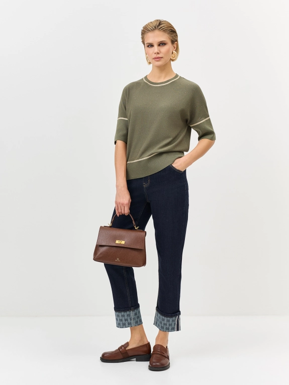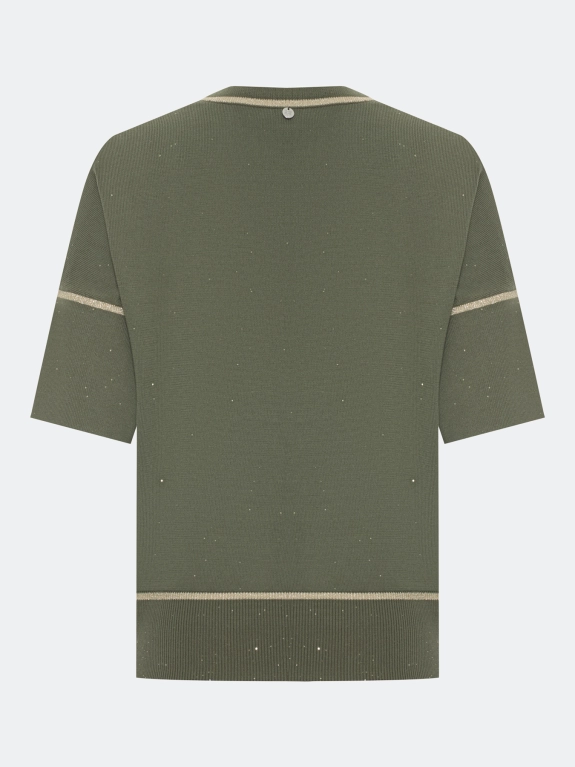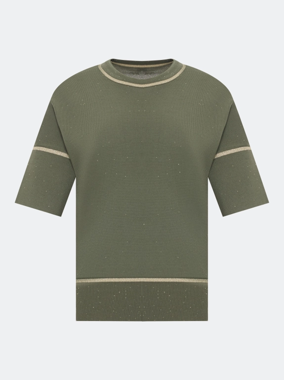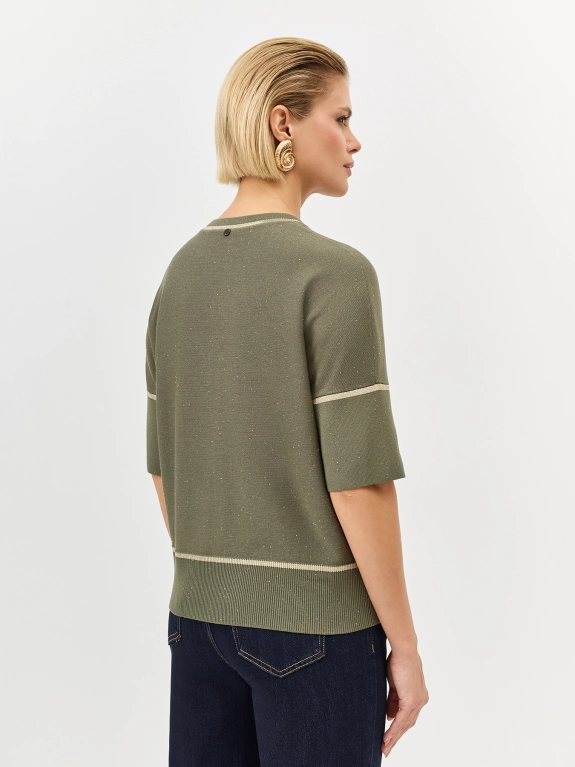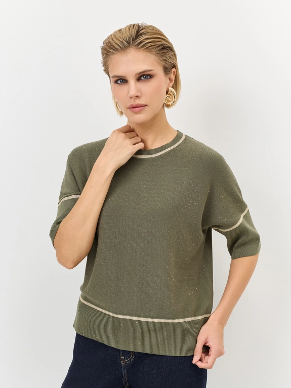 Свободный джемпер с мерцающими пайетками. Круглый вырез. Укороченные рукава. Спущенная линия плеч. Контрастная отделка по горловине, низу рукавов и изделия. Широкие манжеты с блеском по низу рукавов и изделия. В составе хлопок и модал.