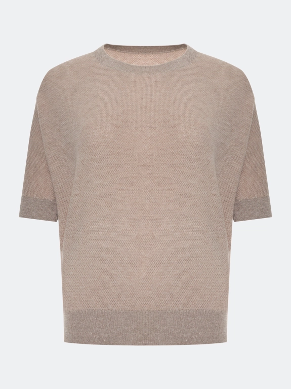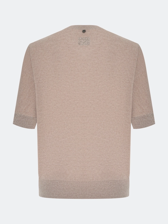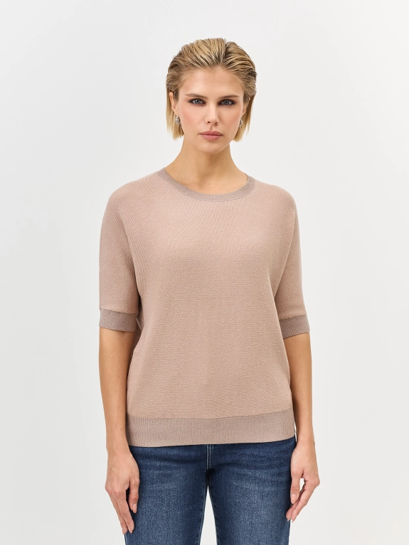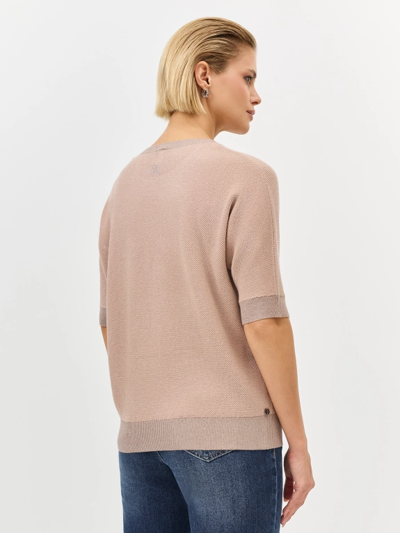 Вязаный джемпер с ангорой. Свободный силуэт. Круглый вырез. Укороченные цельнокроенные рукава. Обработка горловины и манжеты с легким вкраплением люрекса. Деликатная аппликация на спинке.