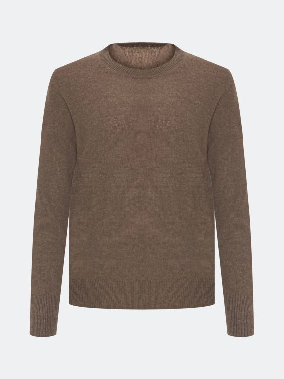 Уютный джемпер из 100% кашемира. Прямой силуэт. Круглый вырез. Спущенная линия плеч. Риб по горловине, низу рукавов и изделия.