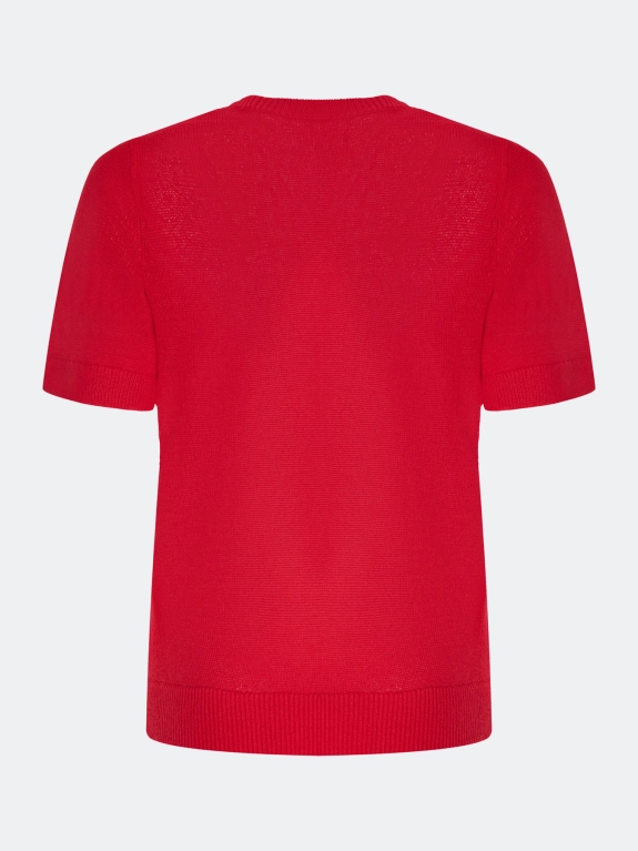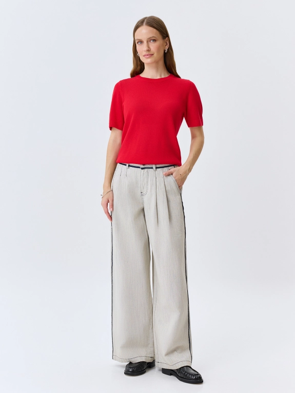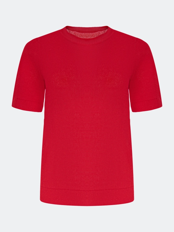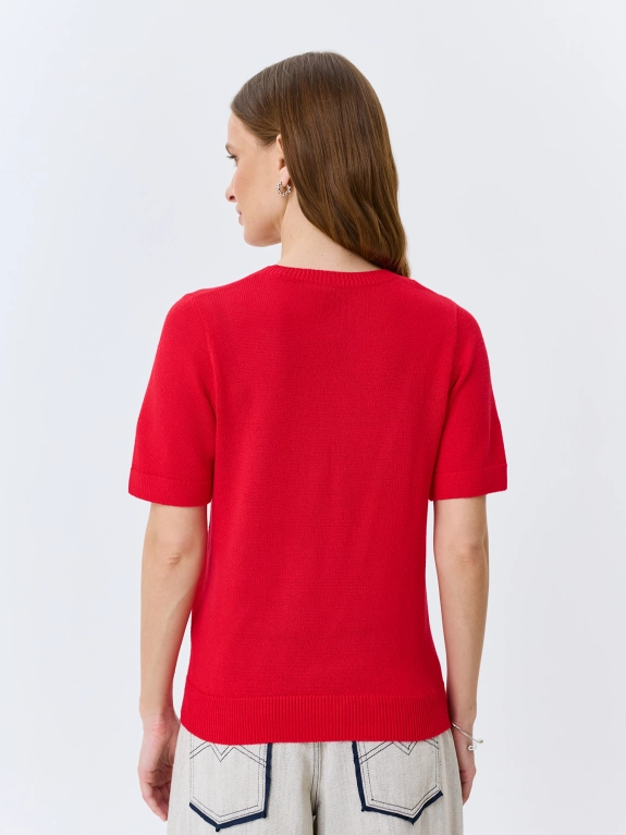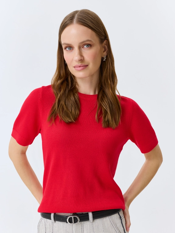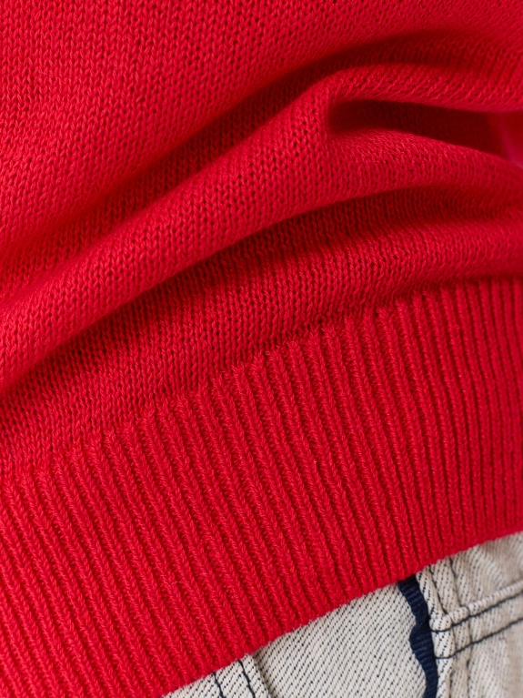 Яркий джемпер из района и льна. Прямой силуэт. Круглый вырез. Короткие втачные рукава. Дополнен рибом по низу рукавов и изделия.