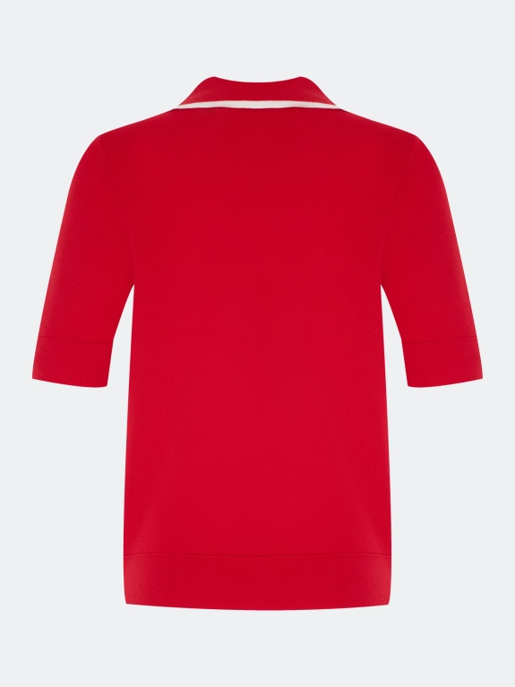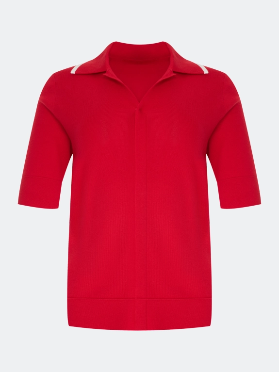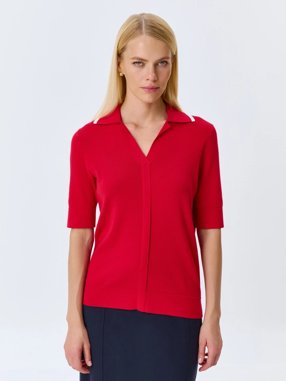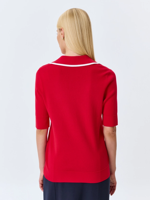 Яркий джемпер-поло из мягкого модала и хлопка. Прямой силуэт. Отложной воротник-поло дополнен контрастным кантом. Застежка на пуговицы. Укороченные рукава.
