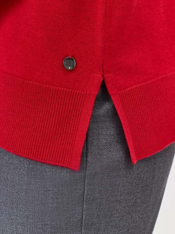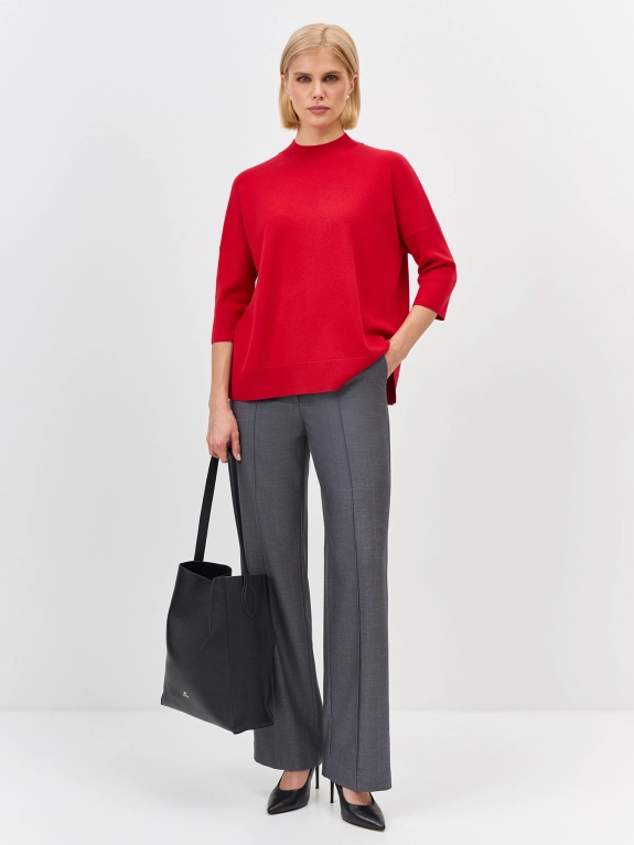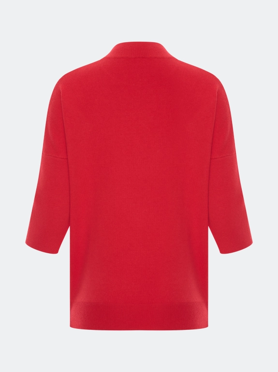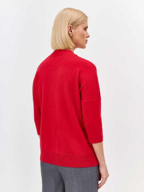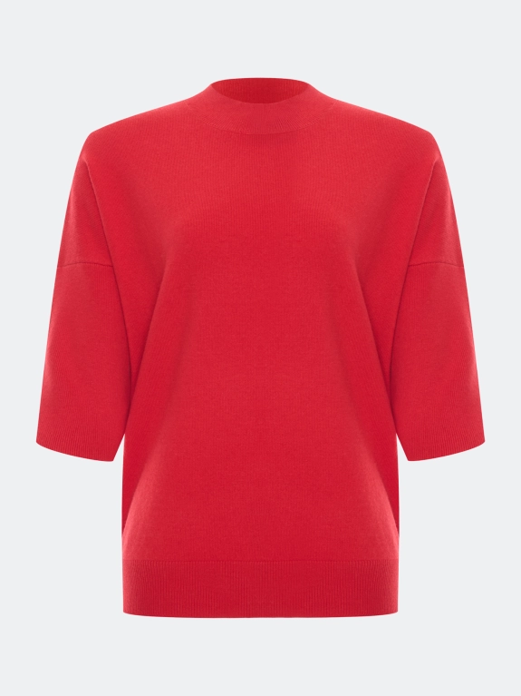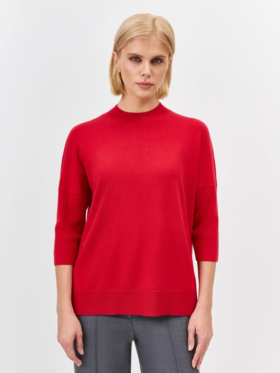 Яркий джемпер с укороченными рукавами. Свободный силуэт. Спущенная линия плеч. Воротник стойка. Рукава 3/4. В составе вискоза и ангора.