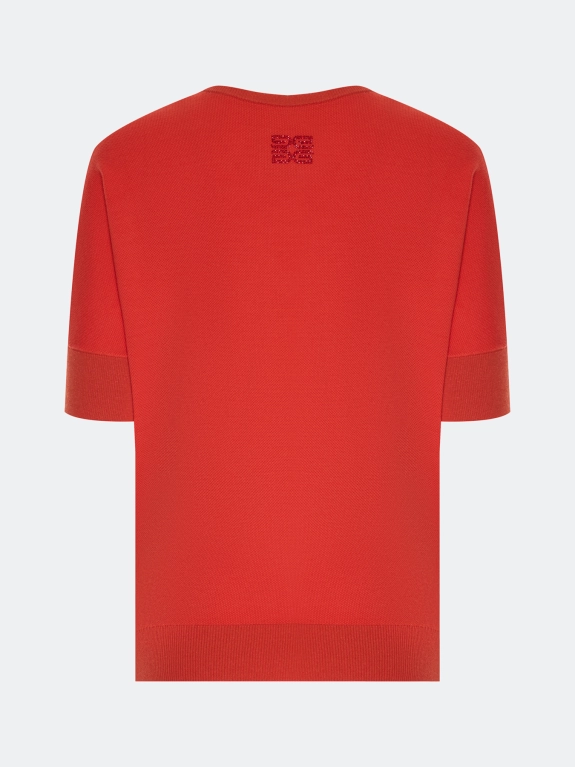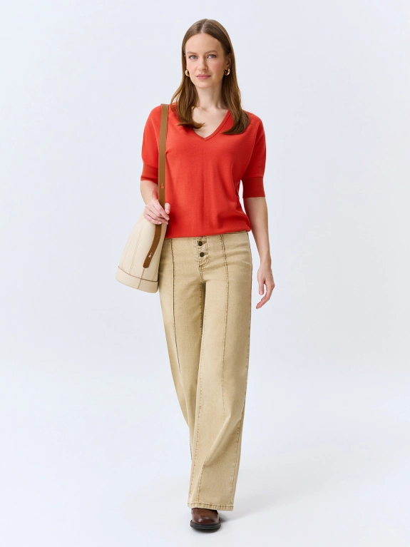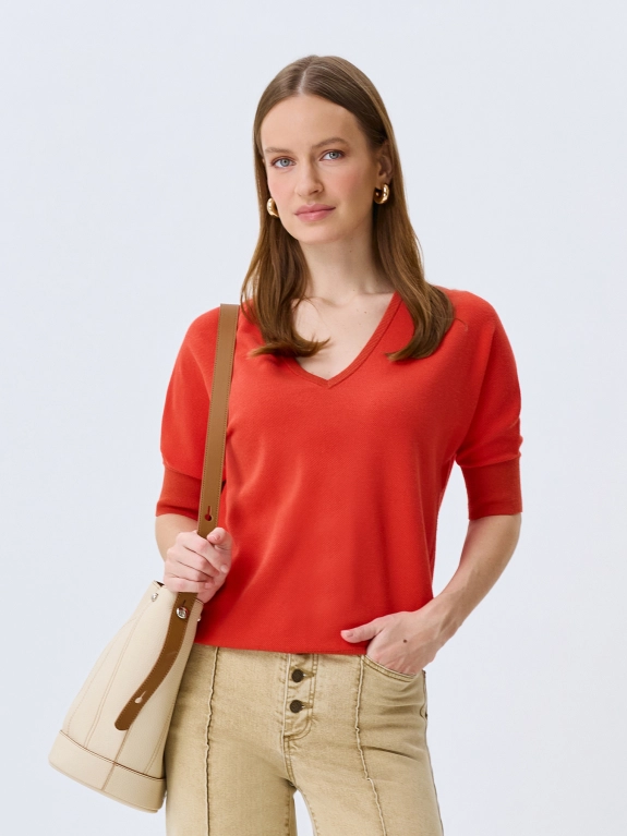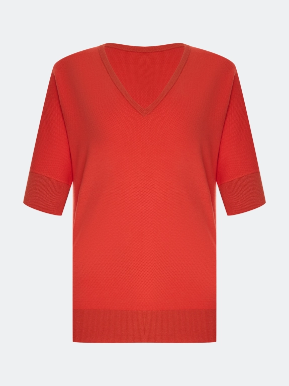 Вязаный джемпер из смесовой вискозы. Свободный силуэт. Спущенная линия плеч и укороченные цельнокроенные рукава дополнены манжетами. V-образный вырез. Риб по низу изделия. Дополнен деликатной вышивкой по спинке. В составе район и модал.