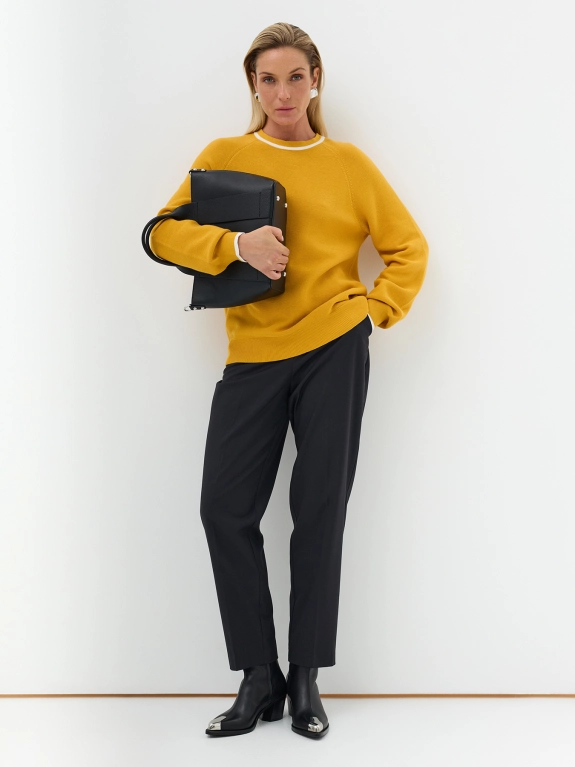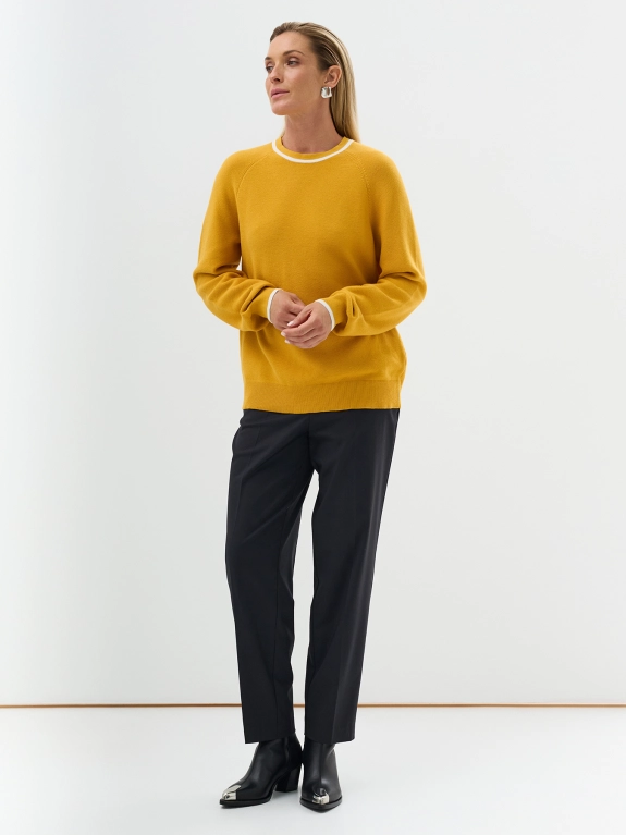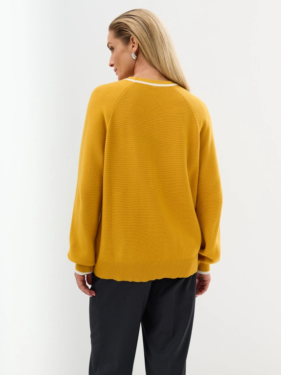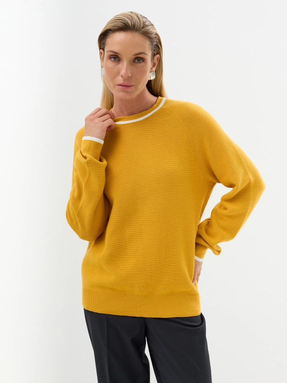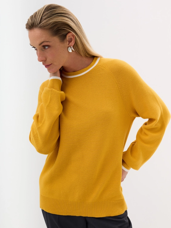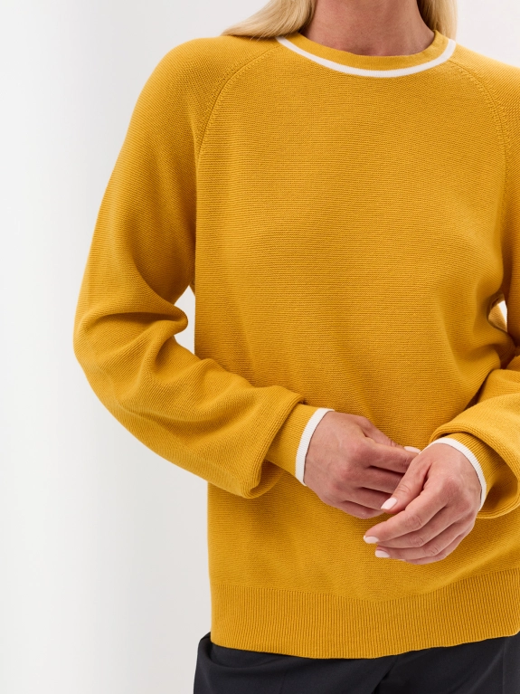 Яркий хлопковый джемпер с фактурной вязкой. Круглый вырез. Прямой силуэт. Рукава реглан. Контрастная отделка по горловине и низу рукавов.
