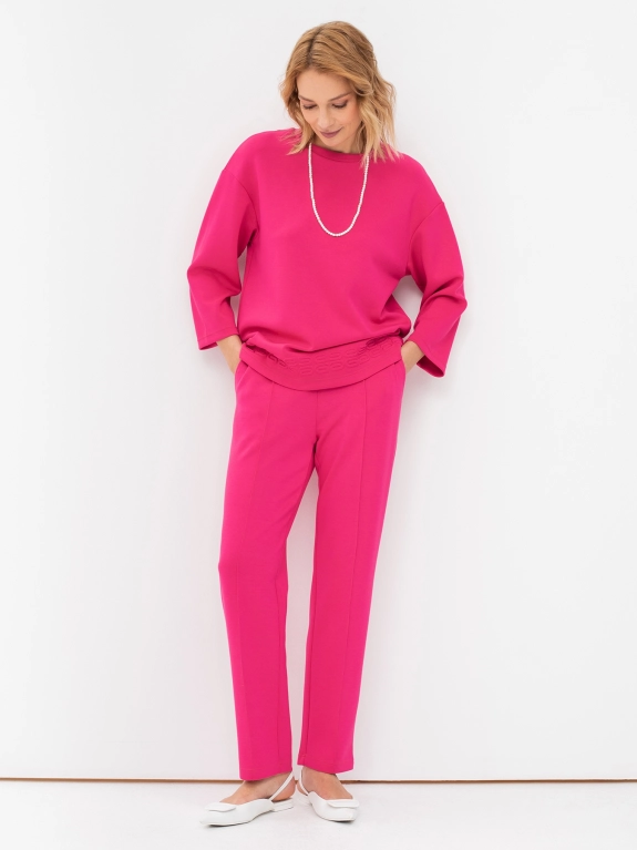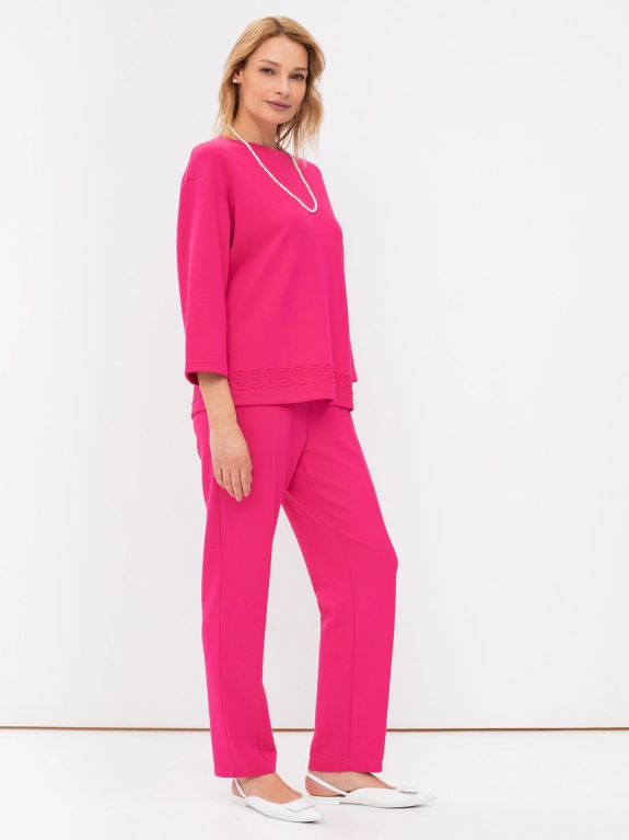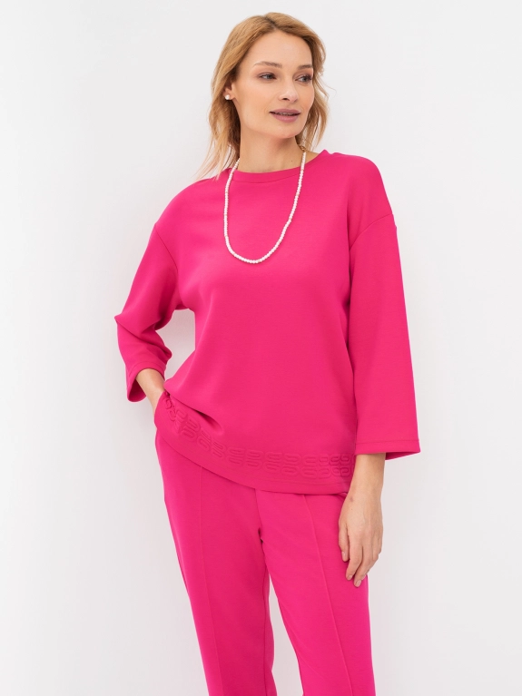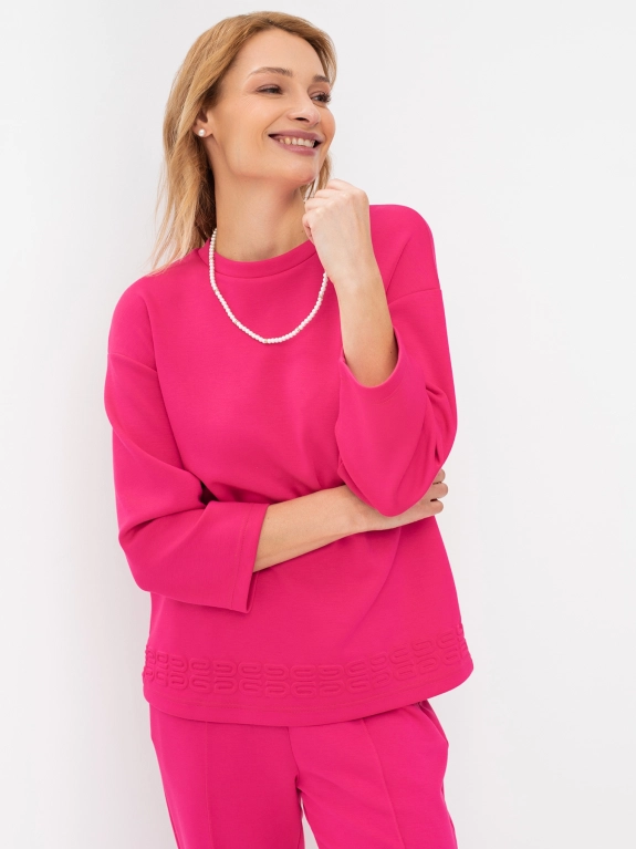 Яркий трикотажный джемпер с объемным декором по низу изделия. Круглый вырез. Плечо спущено. Свободный силуэт. Комплект с 4245841.