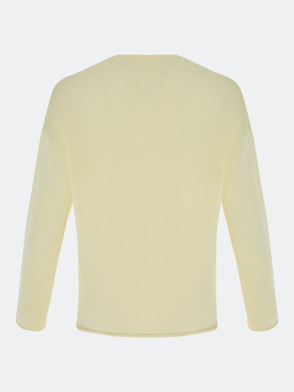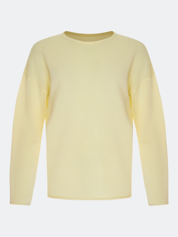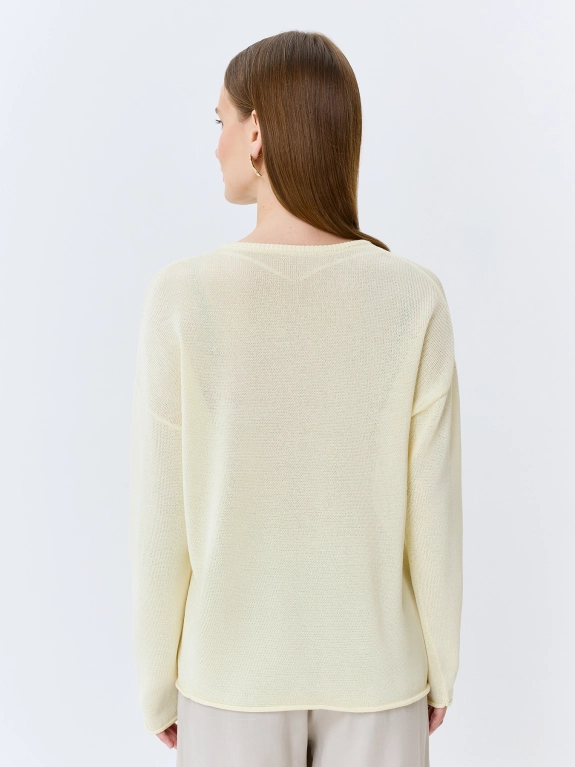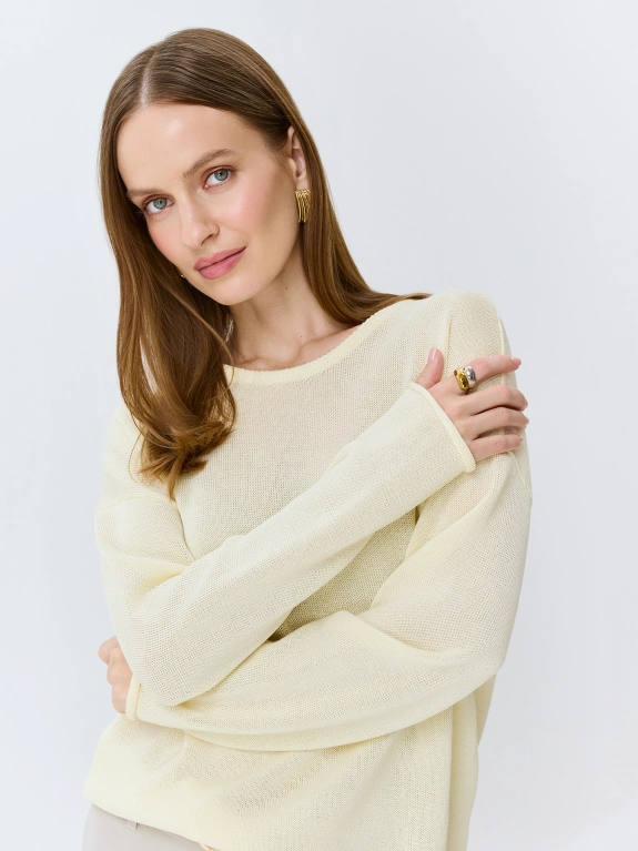 Вязаный джемпер свободного силуэта. Круглый вырез. Спущенная линия плеч и длинные втачные рукава. По низу рукавов и изделия закругленный край. В составе вискоза.