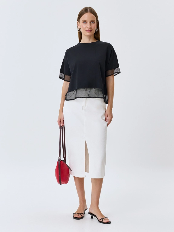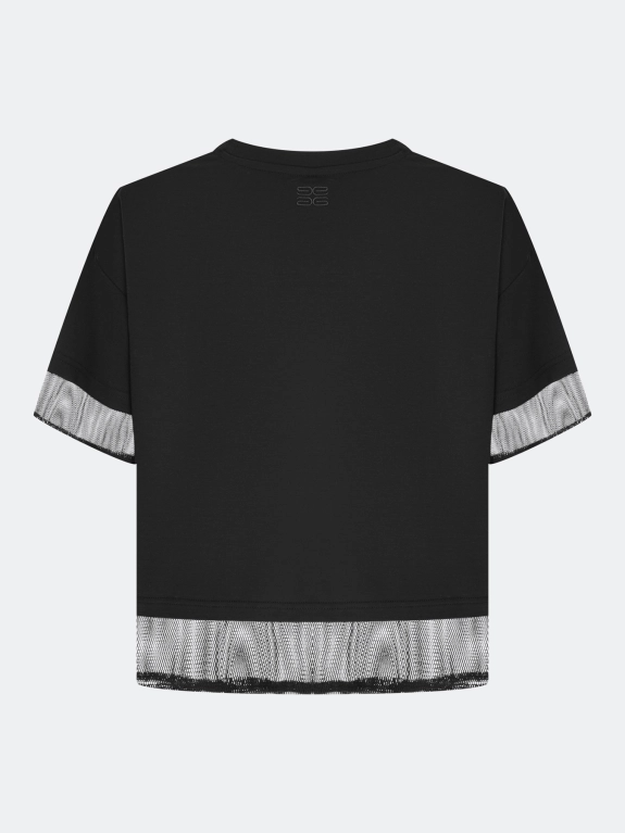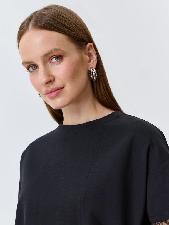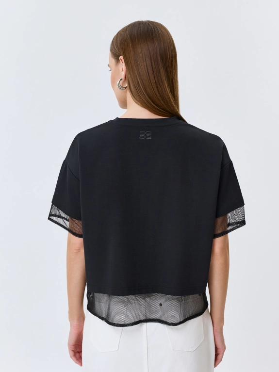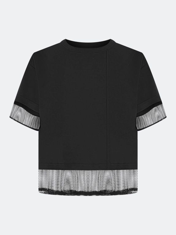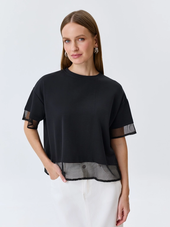 Хлопковый джемпер из хлопка с сетчатыми вставками по низу рукавов и изделия. Прямой силуэт. Круглый вырез. Линия плеч немного спущена. Короткие втачные рукава.