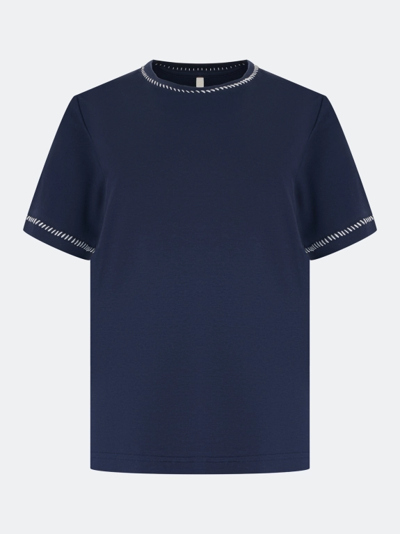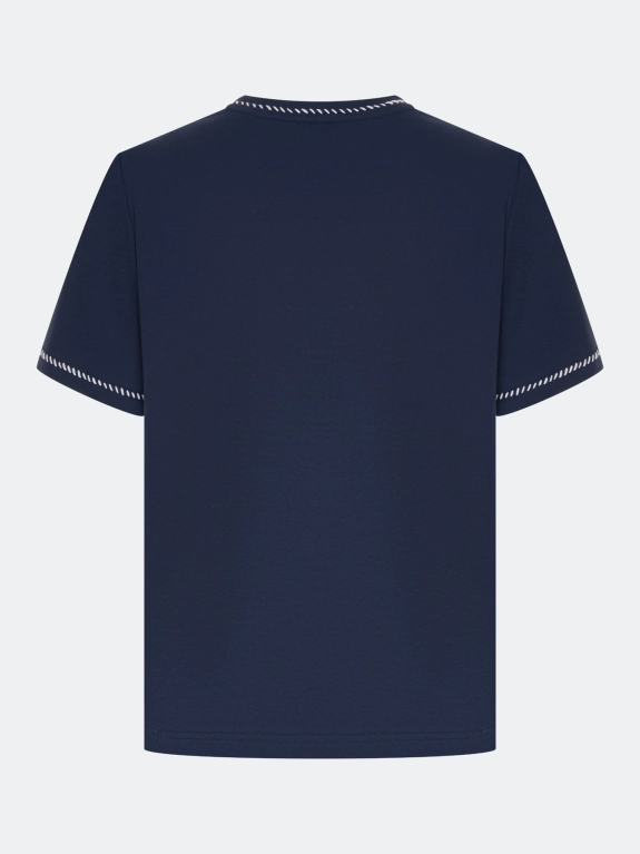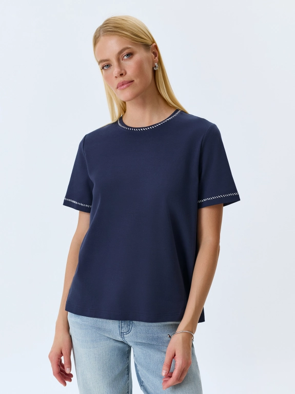Футболка из 100% хлопка. Прямой силуэт. Круглый вырез. Короткие втачные рукава. Дополнена декоративным контрастным стежком по горловине и низу рукавов.