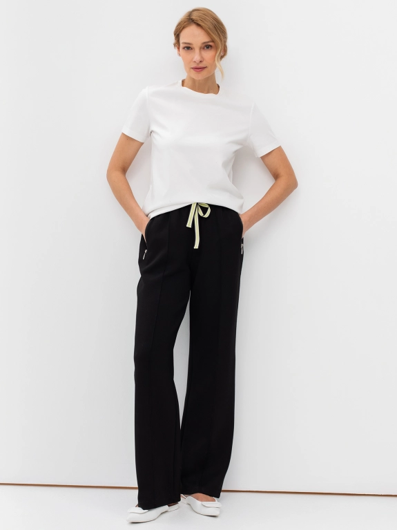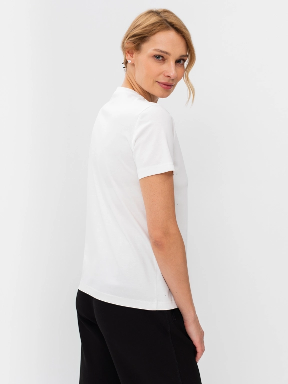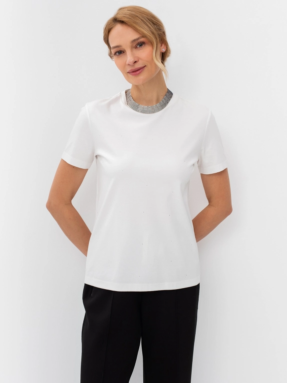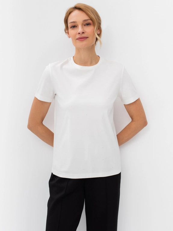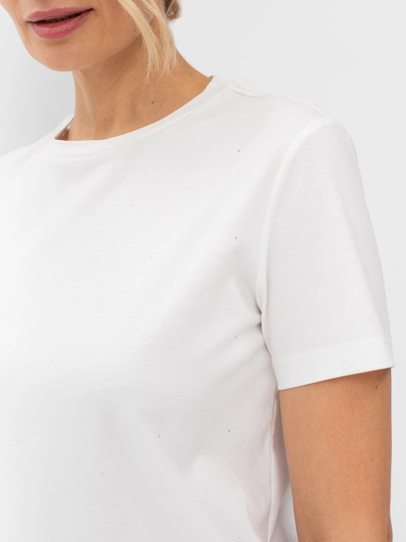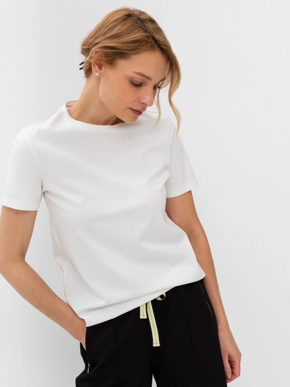 Хлопковая футболка из кроеного трикотажа. Прямой силуэт. Круглый вырез. Украшена стразами.