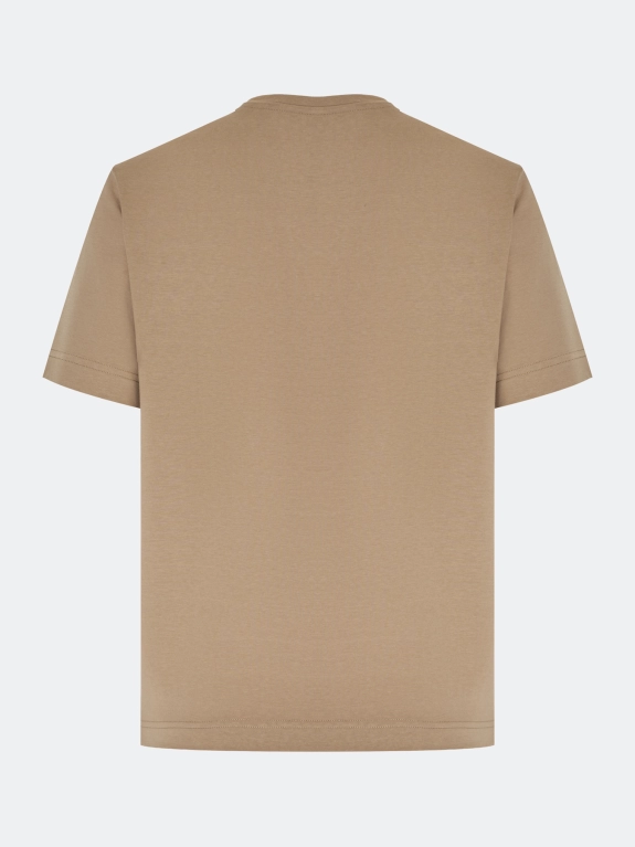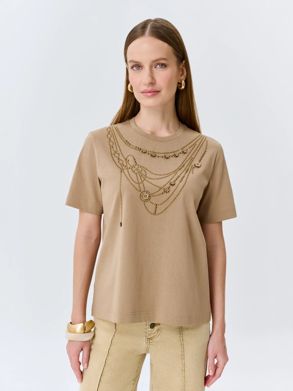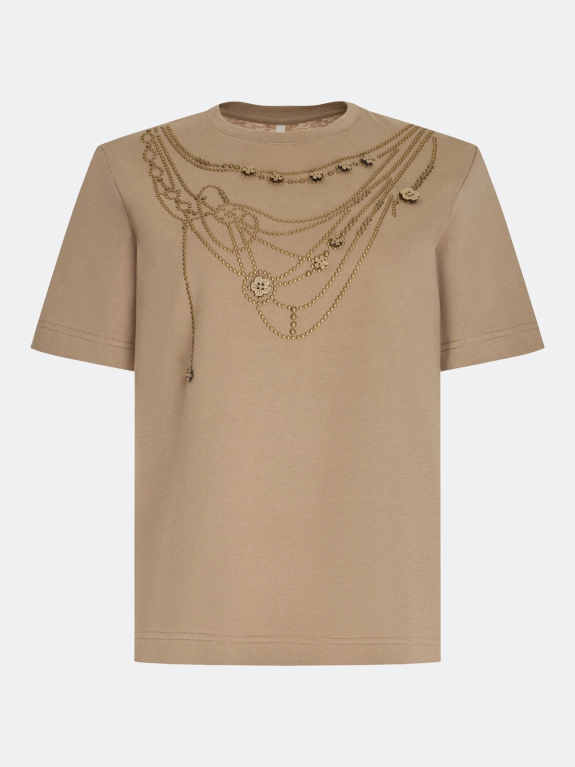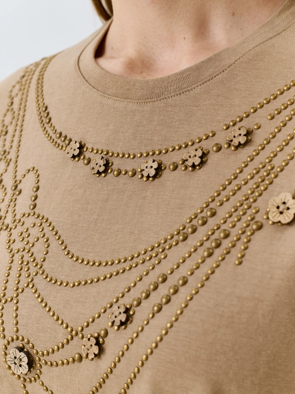 Футболка из трикотажа фламе с акцентным принтом стразами и фигурными пуговицами. Прямой силуэт. Круглый вырез. Короткие втачные рукава.
