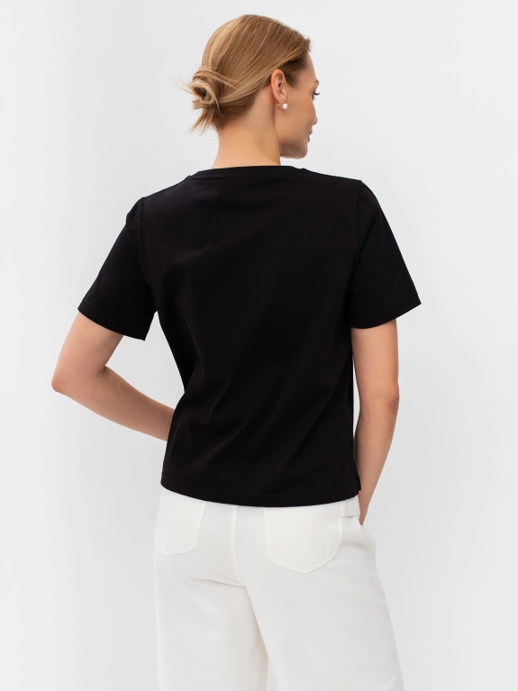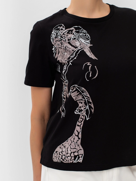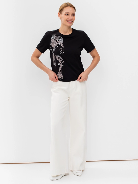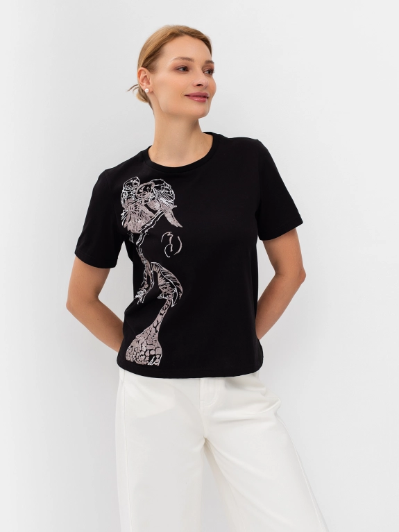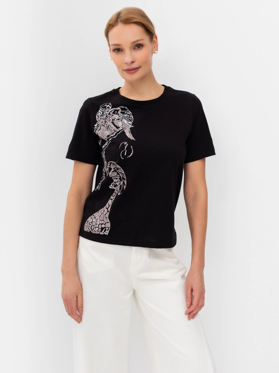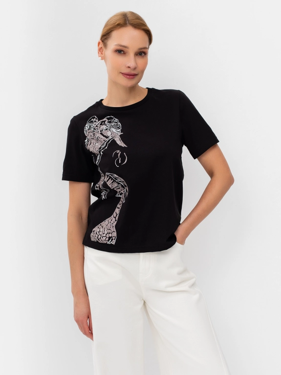 Футболка с акцентным принтом из бусин на полочке. Круглый вырез. Втачной рукав. Прямой силуэт.