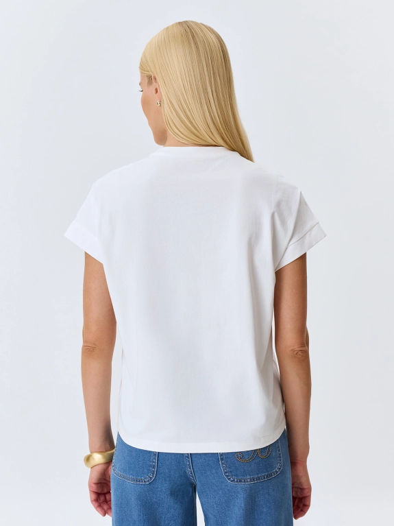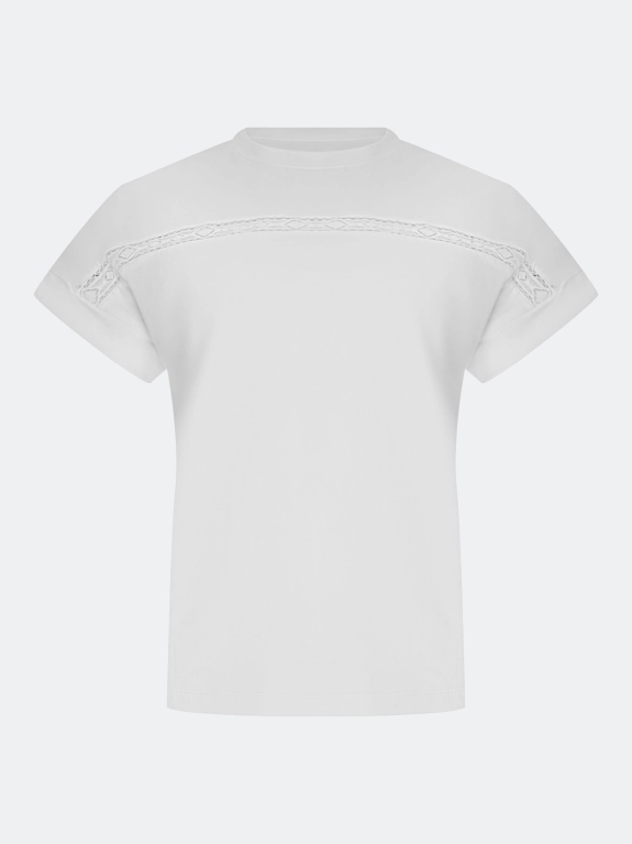 Хлопковая футболка с ажурной вышивкой "ришелье". Прямой силуэт. Круглый вырез. Короткие цельнокроенные рукава с манжетами по низу.