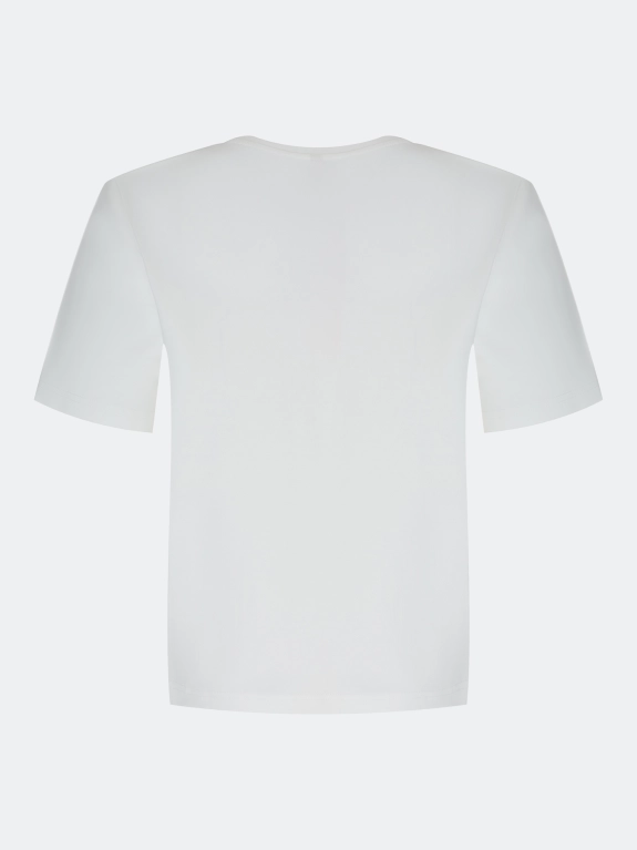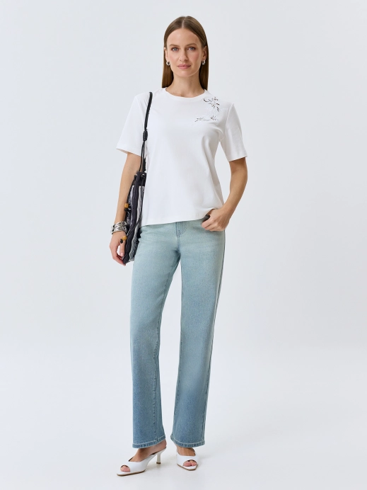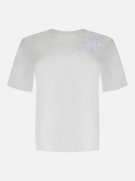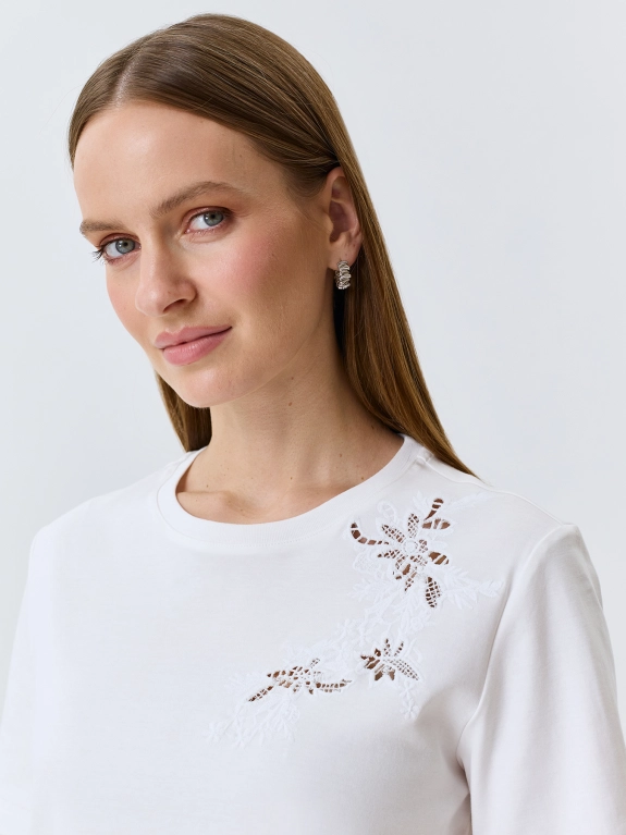 Футболка из 100% хлопка с ажурной флоральной вышивкой на плече. Прямой силуэт. Круглый вырез. Короткие втачные рукава.