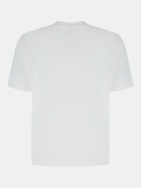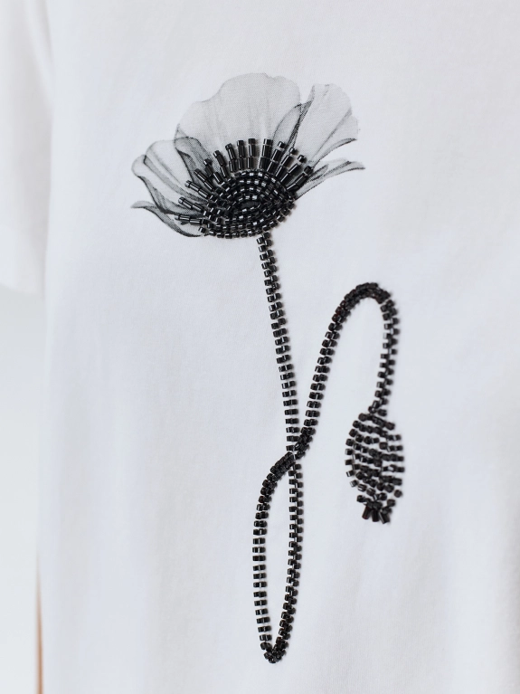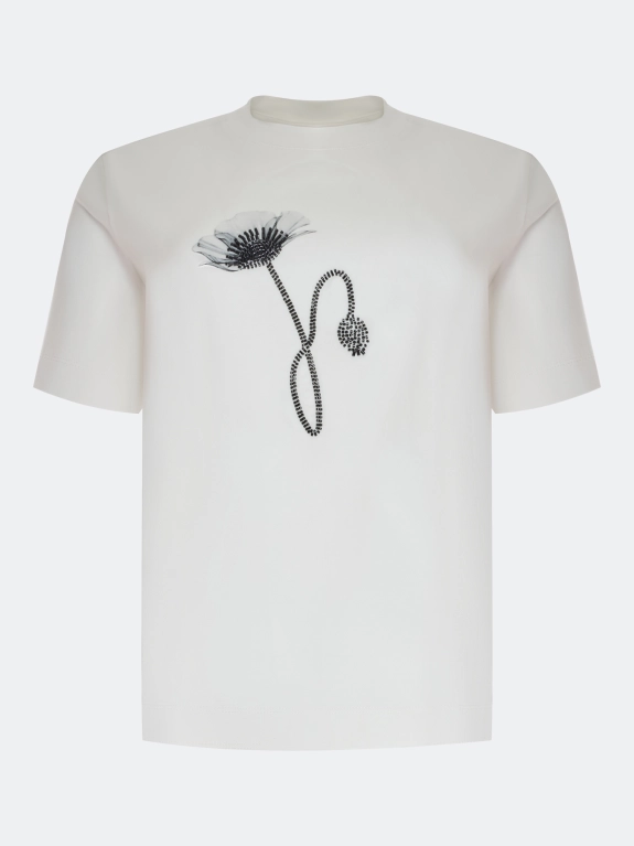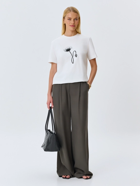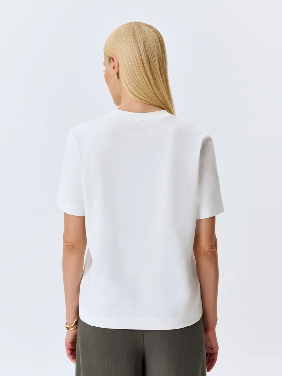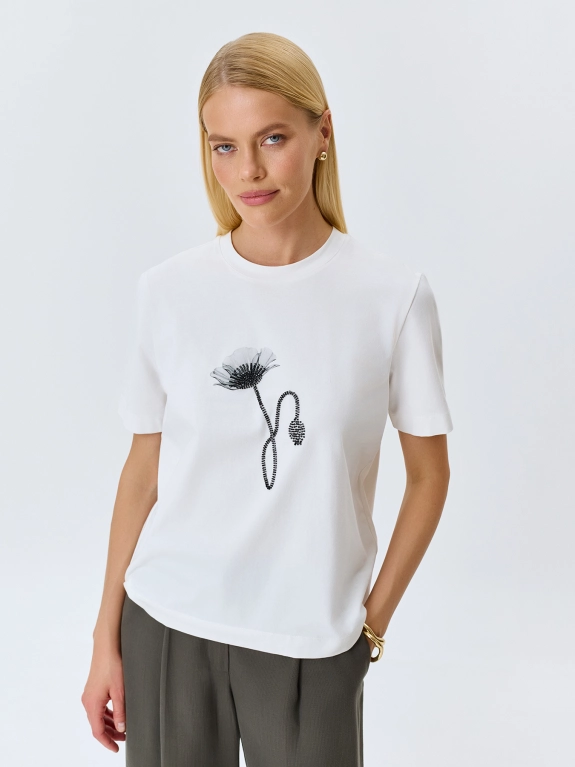 Футболка из мягкого модала с монохромным принтом и вышивкой бисером. Прямой силуэт. Круглый вырез. Короткие втачные рукава.