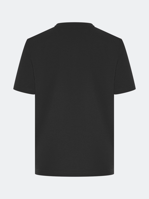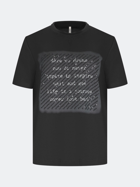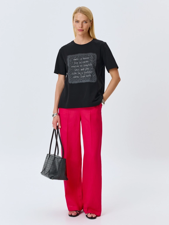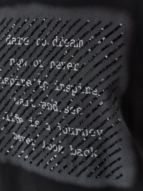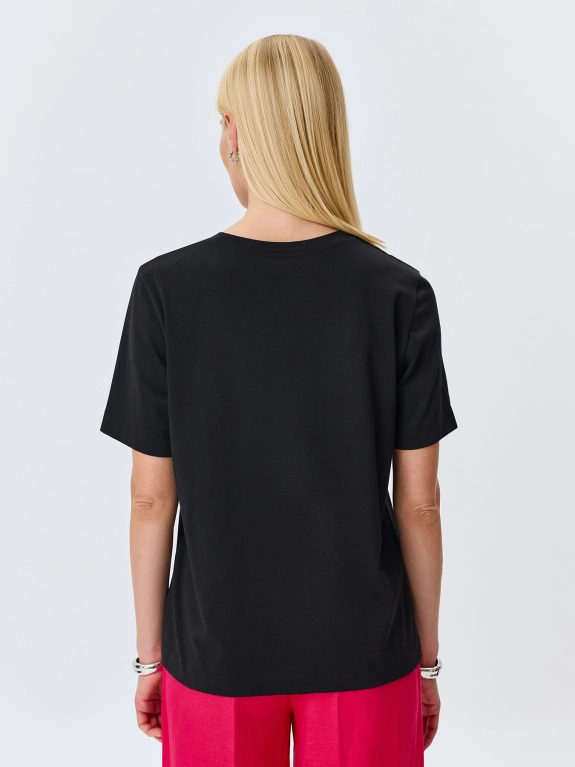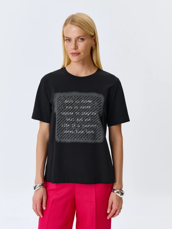 Свободная хлопковая футболка с мерцающей вышивкой пайетками и принтом. Прямой силуэт. Круглый вырез. Короткие втачные рукава.