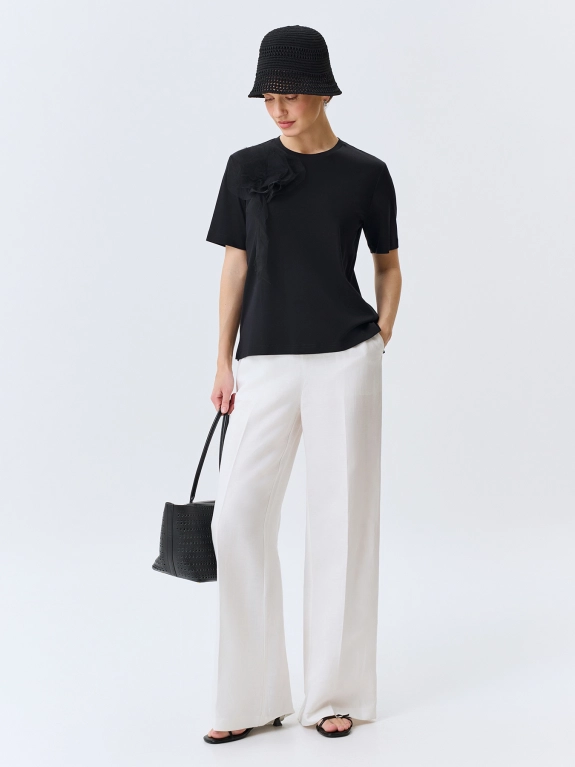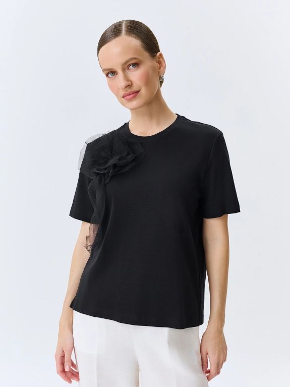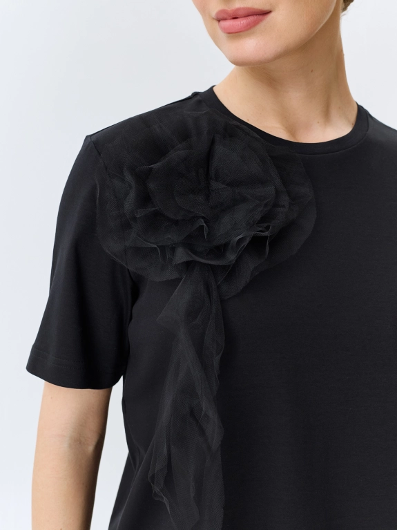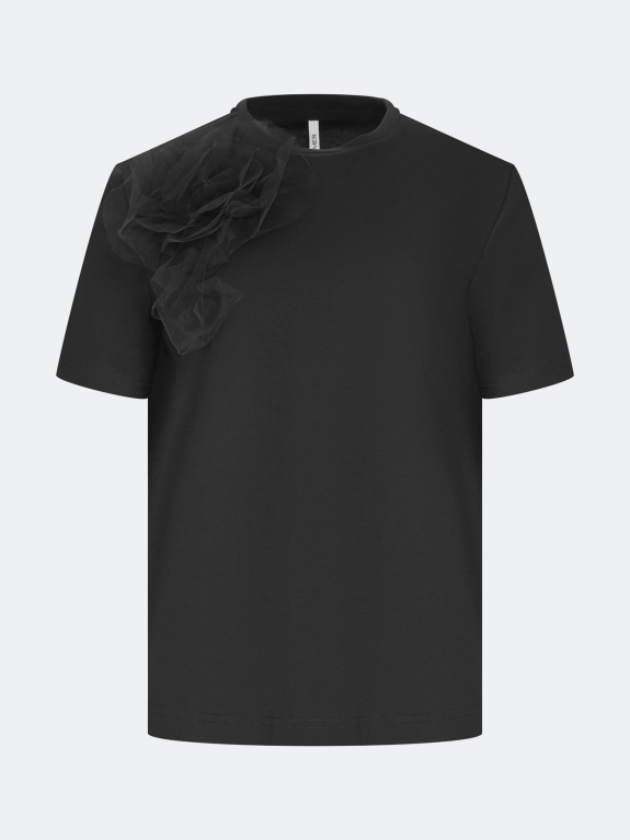 Футболка из 100% хлопка с объемной флоральной аппликацией из мягкого фатина. Прямой силуэт. Круглый вырез. Короткие втачные рукава.