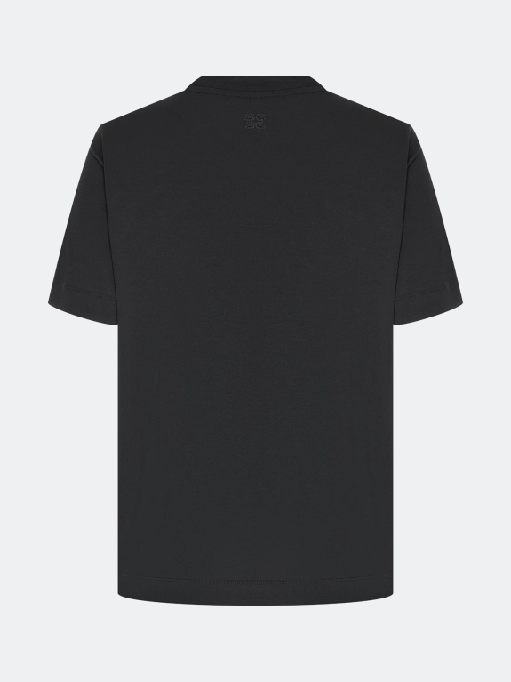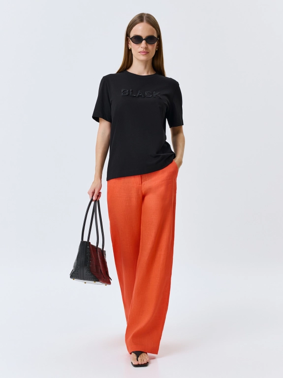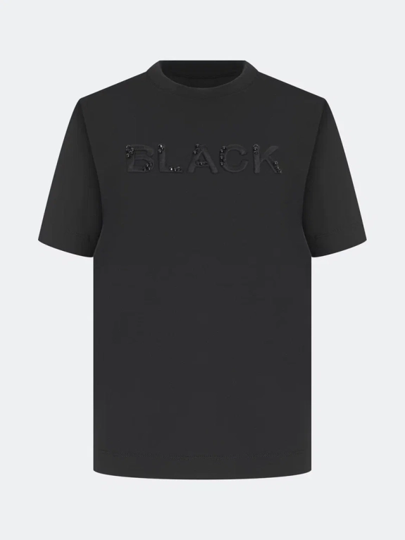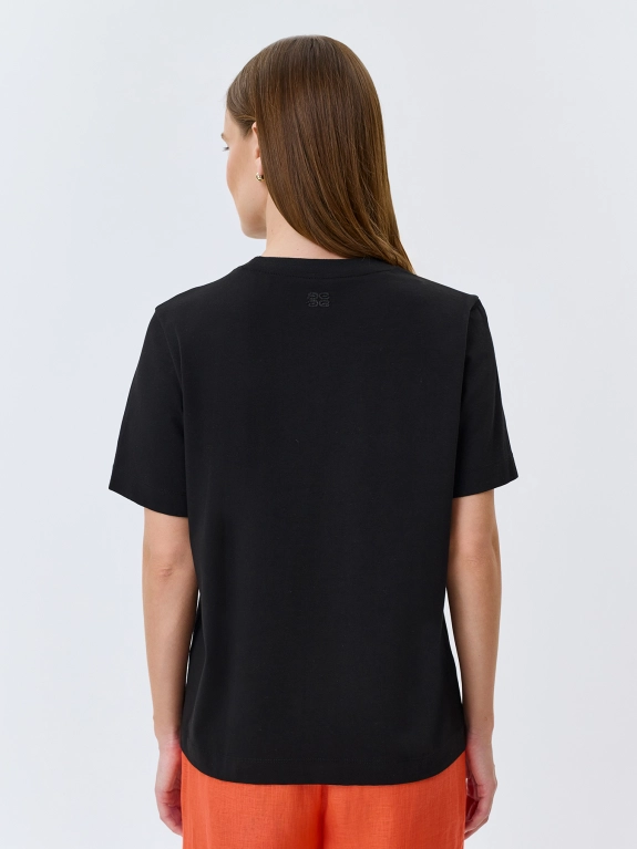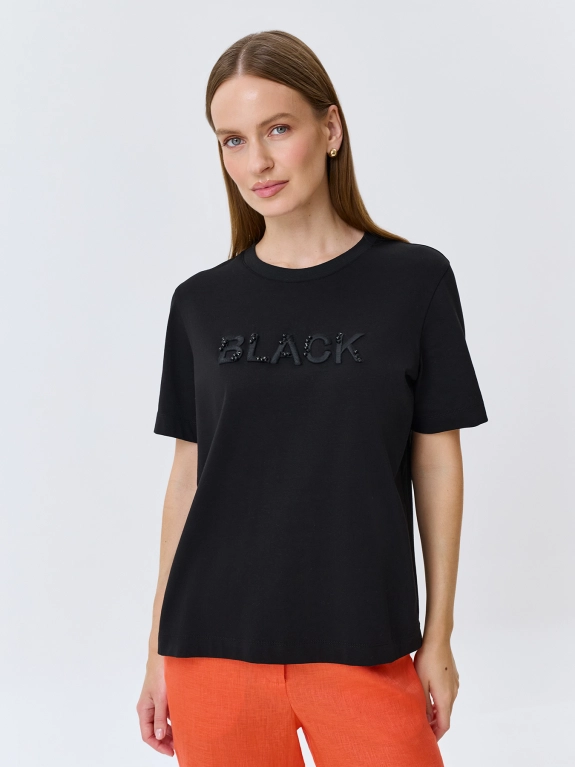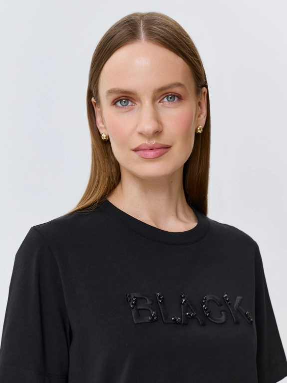 Хлопковая футболка с объемной вышивкой и стразами. Прямой силуэт. Круглый вырез. Короткие втачные рукава.