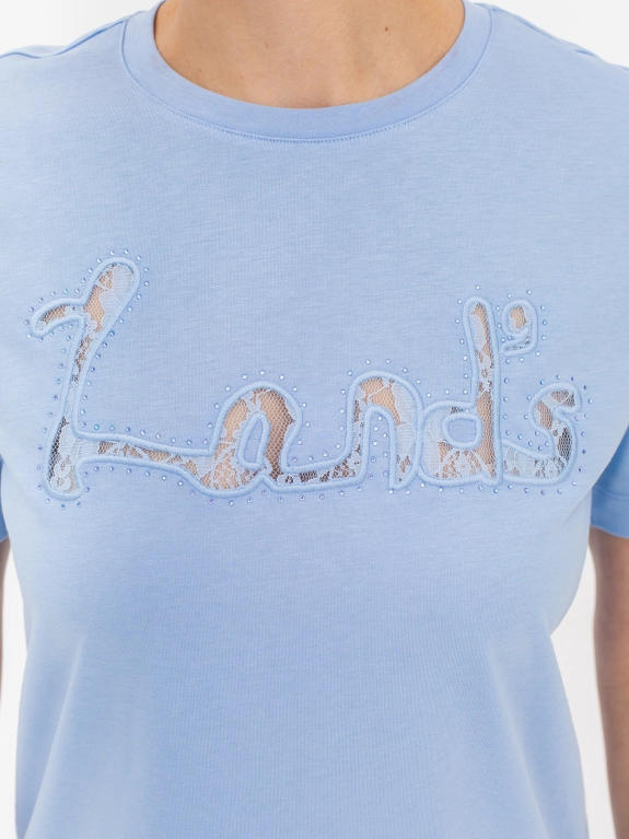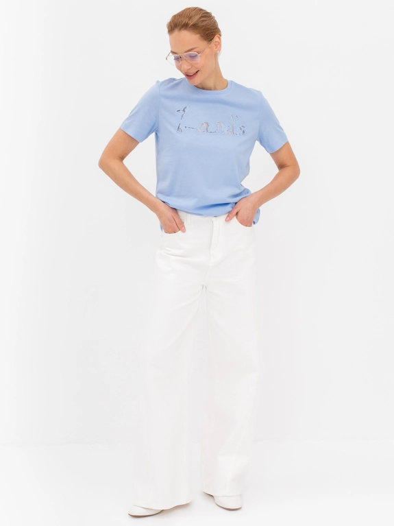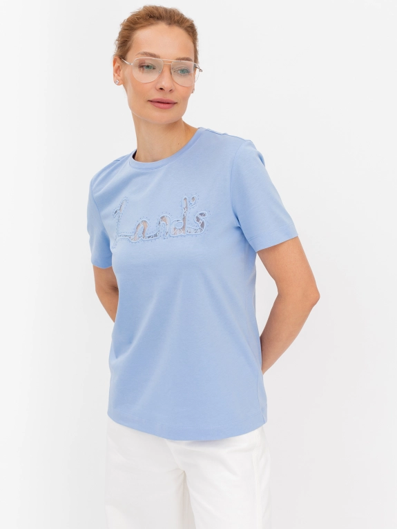 Футболка с вышивкой-аппликацией на передней половинке. Прилегающий силуэт. Круглый вырез.