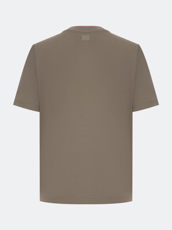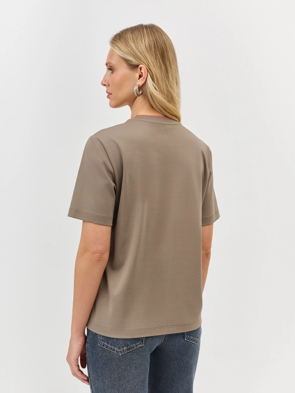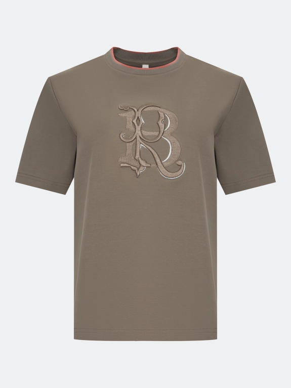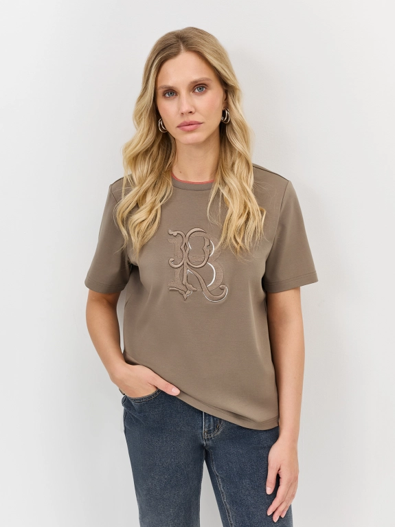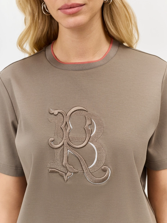 Футболка с акцентной вышивкой монограммой. Прямой силуэт. Круглый вырез. Короткие рукава. Яркий контрастный кант по горловине. Деликатная вышивка в цвет на спинке.