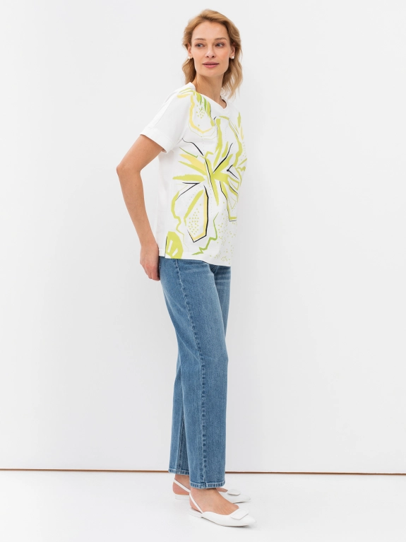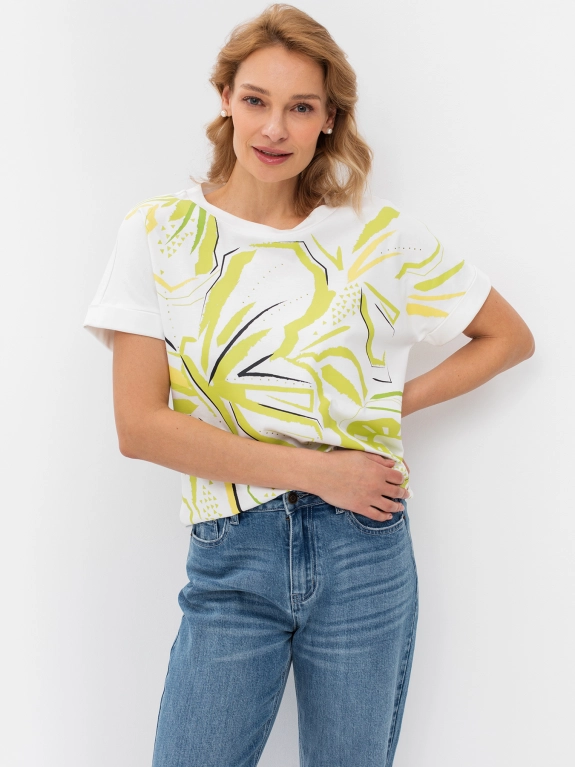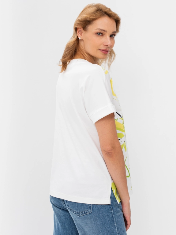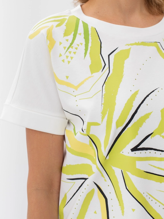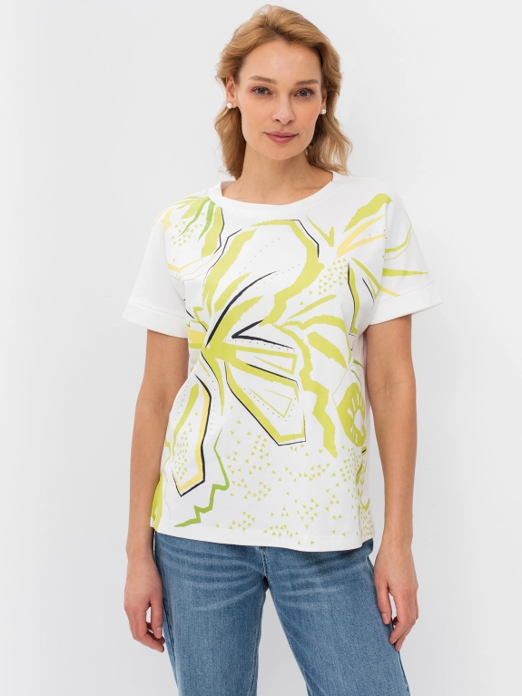 Футболка с ярким принтом по полочке. Рукав цельнокроенный. 100% хлопок. Круглый вырез. Отложные манжеты на рукавах. Свободный силуэт.