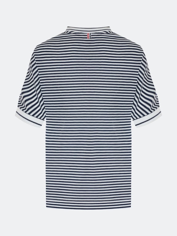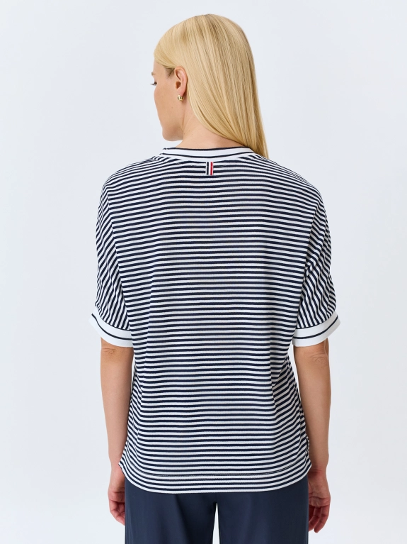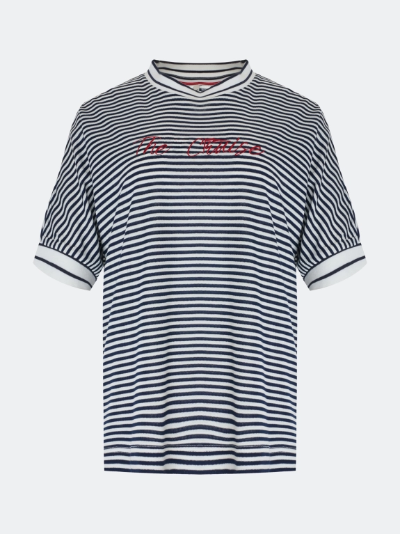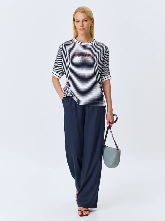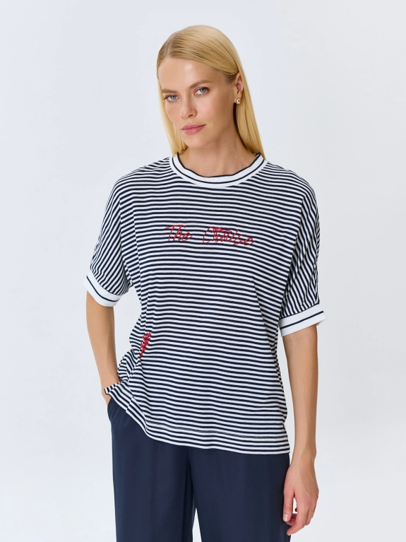 Футболка из смесовой вискозы в тонкую полоску. Прямой силуэт. Круглый вырез. Спущенная линия плеч и укороченные цельнокроенные рукава. Дополнена рибом по горловине и низу рукавов. Украшена контрастной вышивкой.