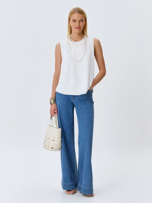 Комбинированный двуслойный трикотажный топ с полупрозрачным шифоном. Свободный силуэт. Круглый вырез. Застежка на пуговицу. Дополнен мягкими складками по спинке.