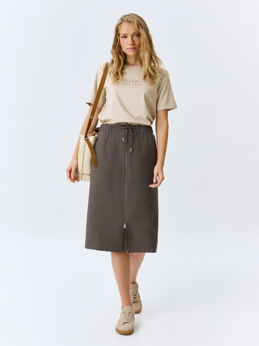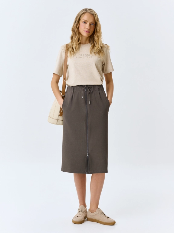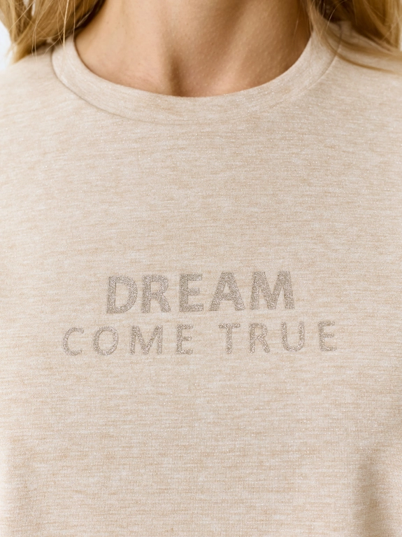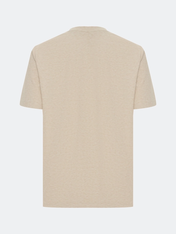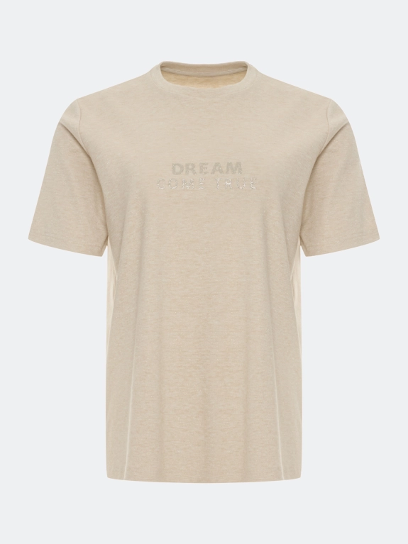 Меланжевая футболка из смесовой вискозы. Прямой силуэт. Круглый вырез. Короткие втачные рукава. Дополнена деликатным мерцающим принтом.