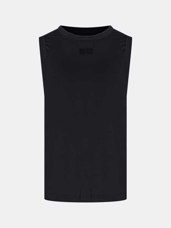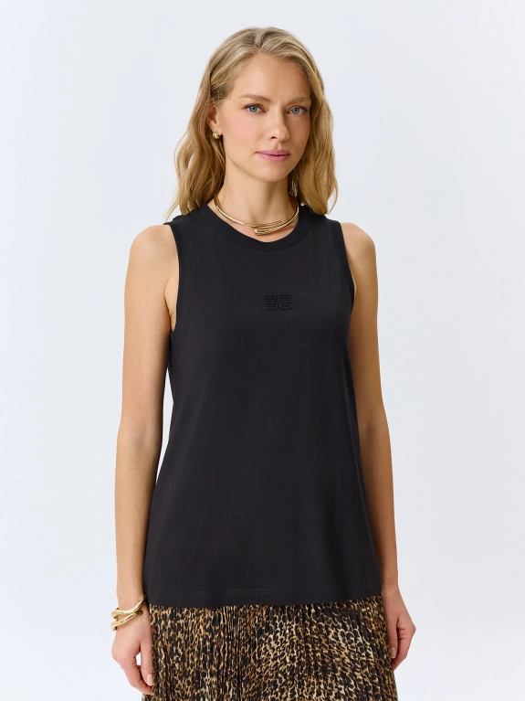 Топ из бамбукового волокна. Полуприталенный силуэт. Круглый вырез. Дополнен рибом по плечам и горловине. В составе спандекс.
