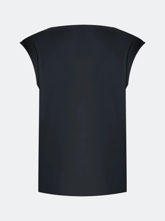 Топ из смесового района с акцентной драпировкой. Полуприталенный силуэт. Вырез качель с драпировкой.