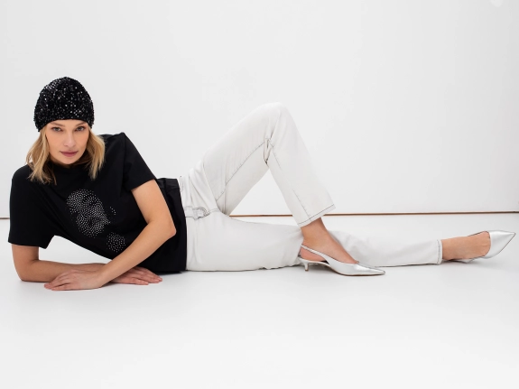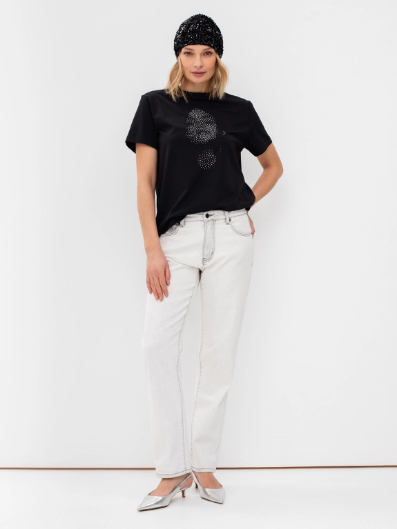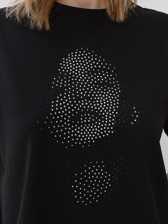 Футболка из кроеного трикотажа с аппликацией из страз. Круглый вырез. Свободный силуэт. Втачной рукав.