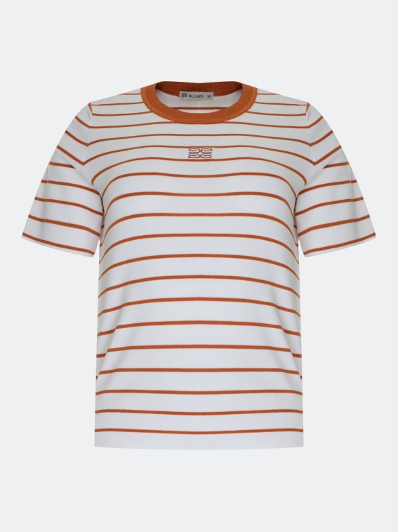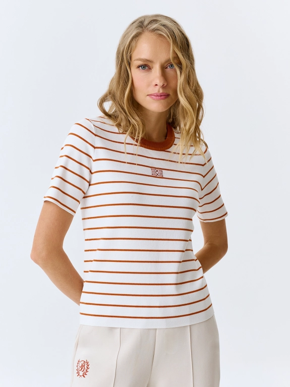 Вязаная футболка в яркую полоску. Прямой силуэт. Круглый вырез дополнен контрастным рибом. Короткие втачные рукава. Дополнен контрастной вышивкой. В составе вискоза.