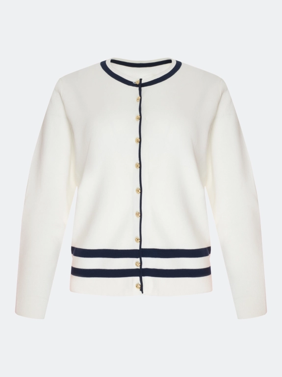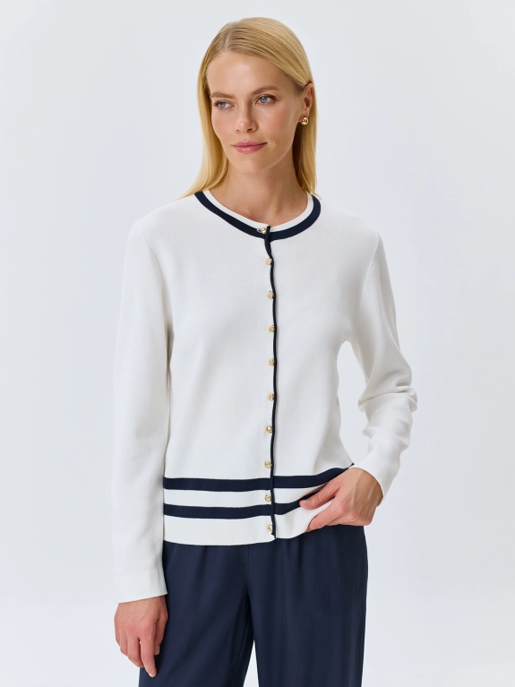 Кардиган из мягкого модала и хлопка с контрастной отделкой. Прямой силуэт. Круглый вырез. Застежка на золотистые пуговицы. Длинные втачные рукава.