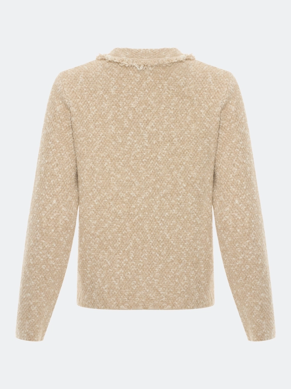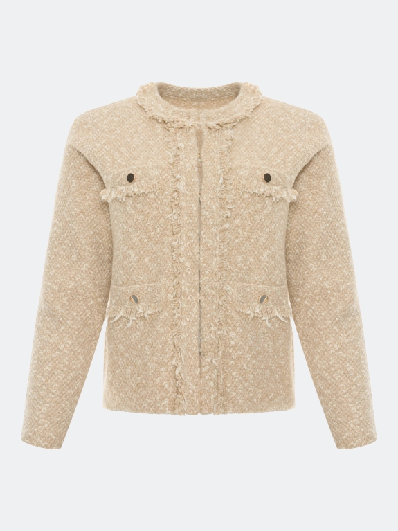 Укороченный вязаный кардиган в стиле "chanel''. Прямой силуэт. Фактурная вязка с деликатным люрексом. Круглый вырез. Застежка на металлические крючки. Боковые и нагрудные накладные карманы с планками и декоративными пуговицами. В составе хлопок.