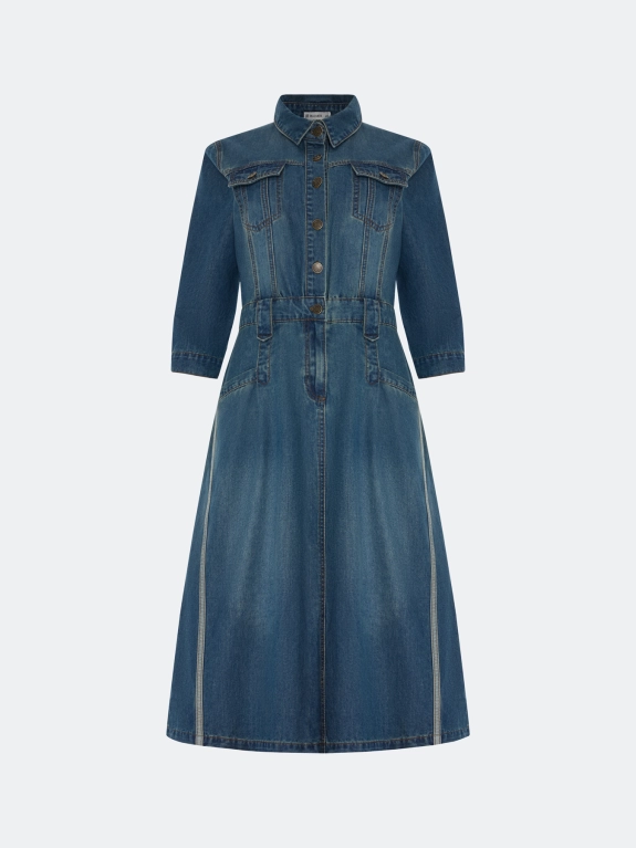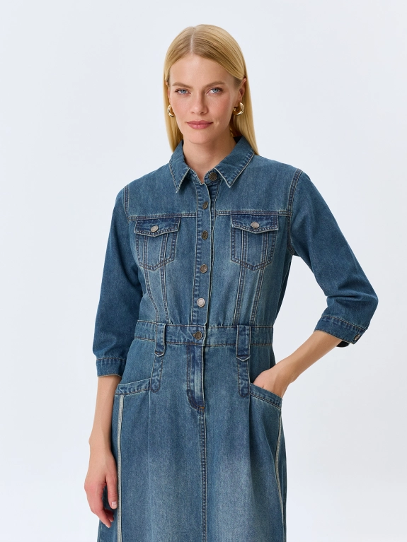 Платье-рубашка из денима с деликатной варкой. Длина миди. Полуприталенный силуэт. Отложной воротник. Застежка на металлические пуговицы. Укороченные втачные рукава. Боковые карманы с листочками. Накладные нагрудные карманы с клапанами на металлических пуговицах. Дополнено контрастной отделкой по рельефным швам и задним карманам.