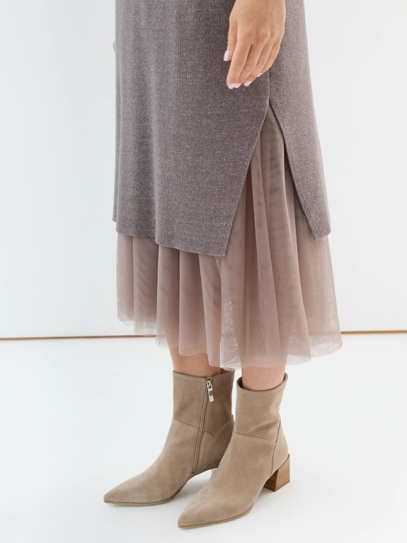 Комбинированное платье из хлопковой пряжи с нижним платьем из трикотажной сетки. Круглый вырез. Прямой силуэт. Деликатный люрекс. Рукава 3/4.