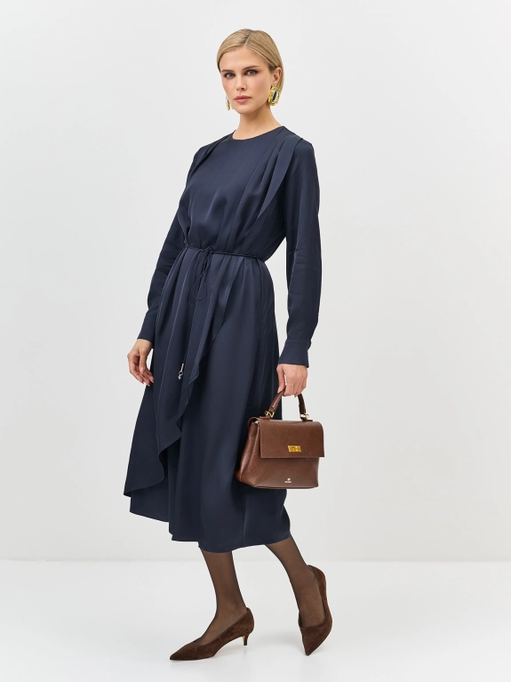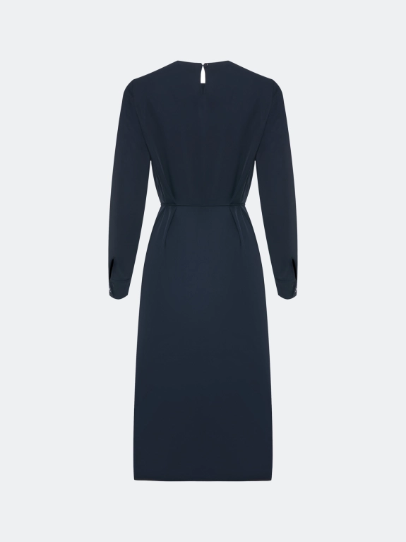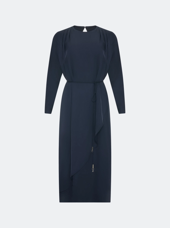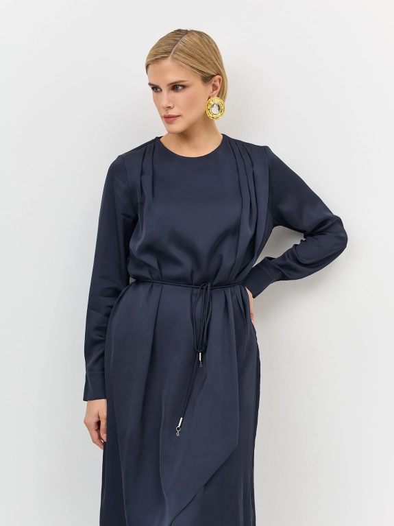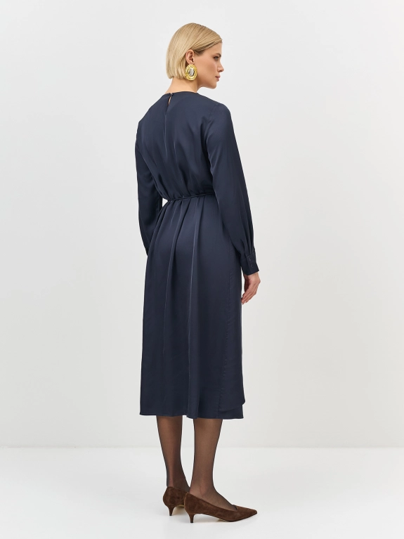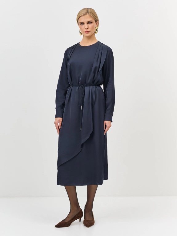 Платье-миди с изысканной драпировкой. Свободный силуэт можно приталить тонким поясом с металлическим декором. Круглый вырез. Застежка на молнию и маленькую пуговицу. Манжеты на пуговицах по низу рукавов. В составе 100% вискоза.