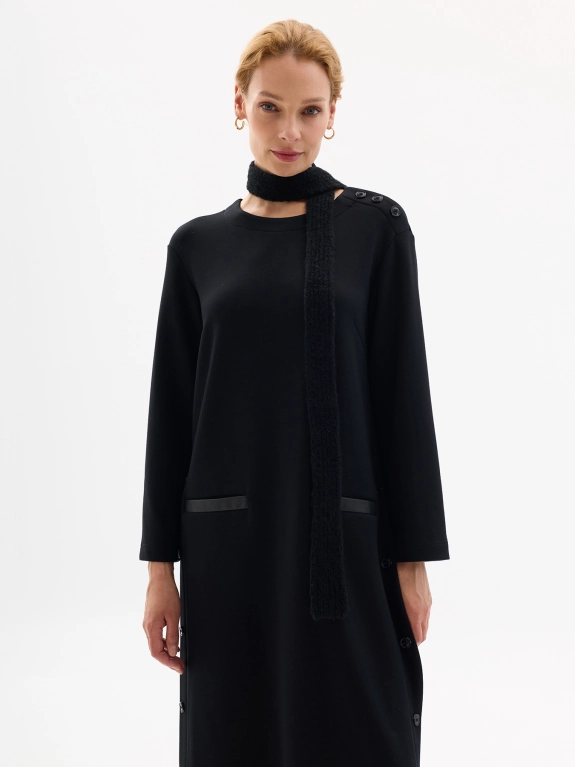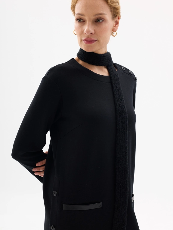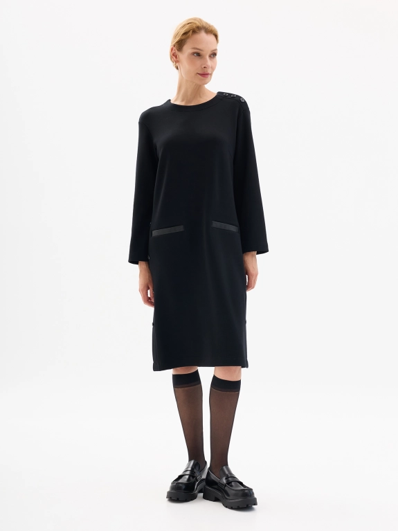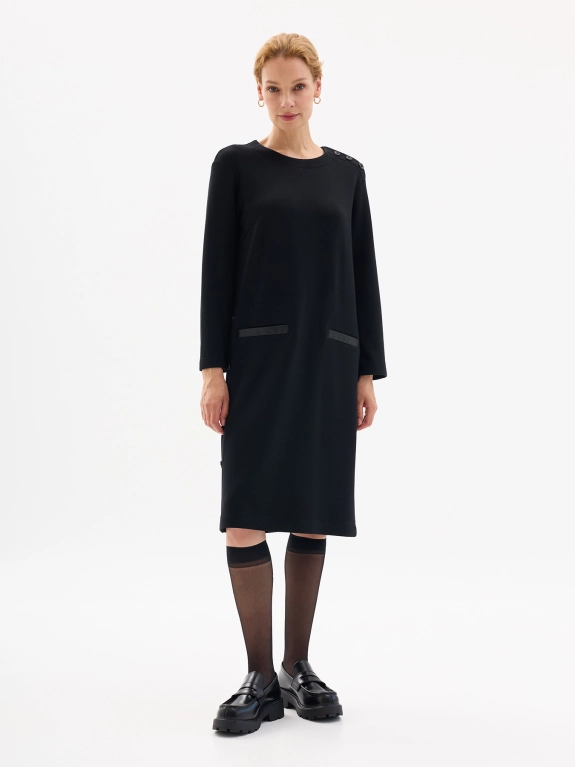 Платье прямого силуэта с акцентными пуговицами по плечам и боковым швам. Круглый вырез. В составе район. Карманы с клапанами из экокожи.