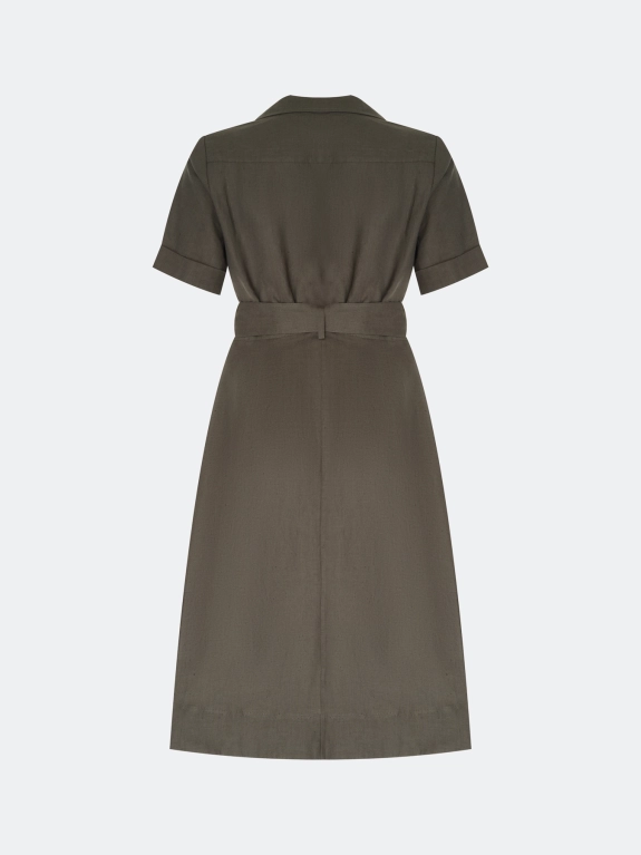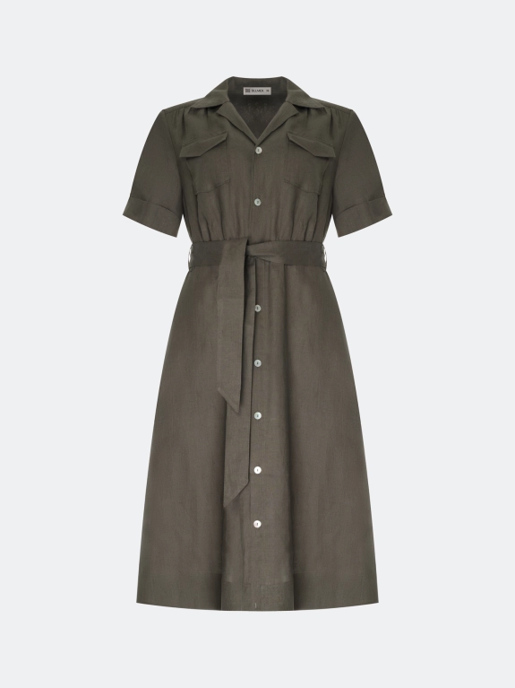 Платье-рубашка в колониальном стиле из 100% льна. Длина миди. Приталенный силуэт дополнен поясом. Классический английский воротник. Застежка на пуговицы. Укороченные широкие втачные рукава с манжетами по низу. Боковые карманы в швах. Накладные нагрудные карманы с клапанами.