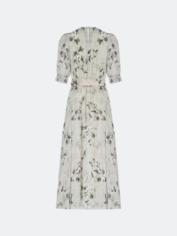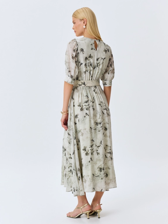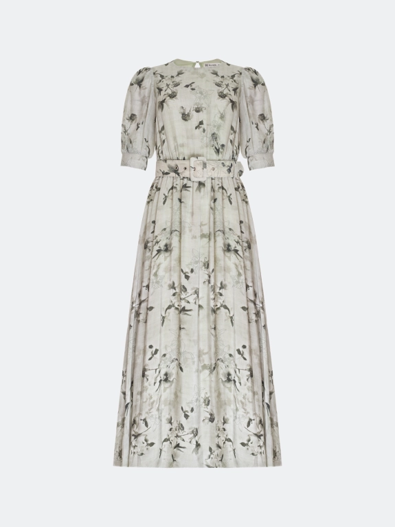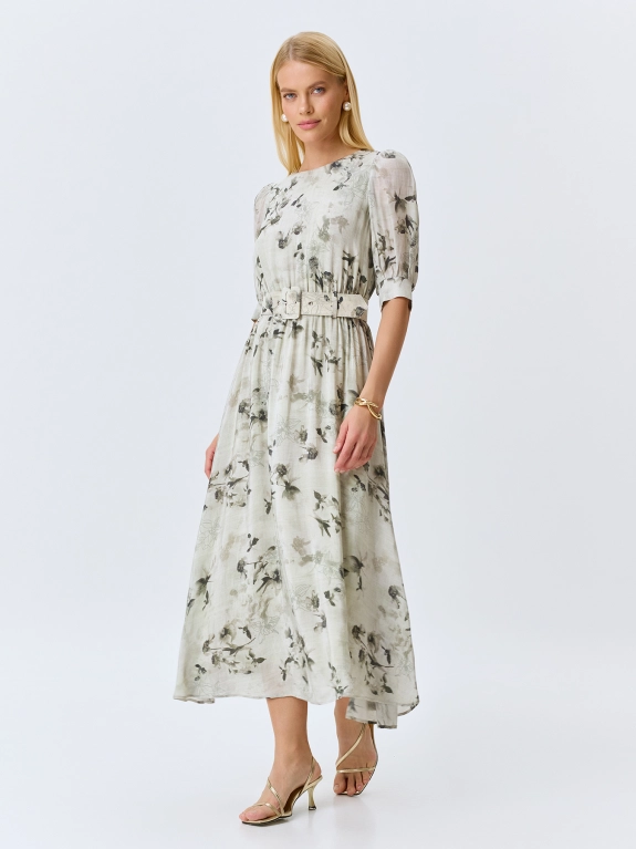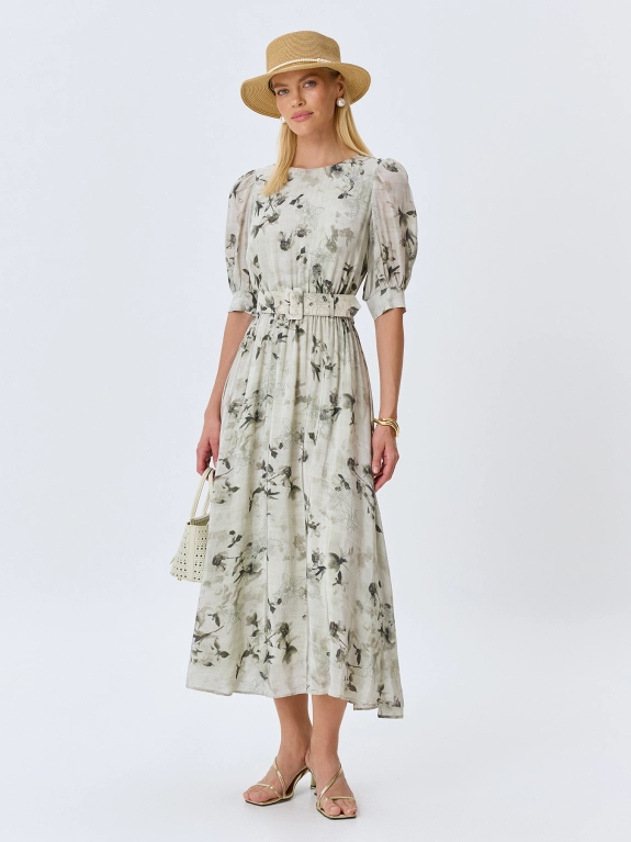Платье-миди из 100% вискозы с флоральным принтом. Полуприталенный силуэт с расклешенной юбкой. Резинка и пояс с пряжкой по линии талии. Круглый вырез. Укороченные рукава-фонарики с манжетами по низу. Застежка на пуговицу. Дополнено деликатными складками. Подкладка из 100% вискозы.