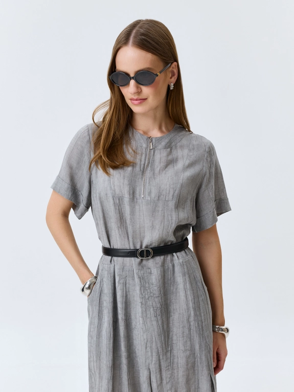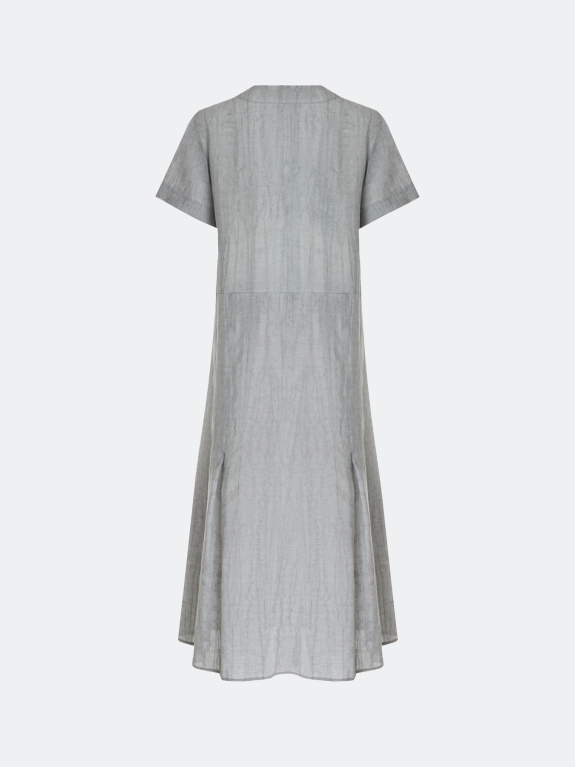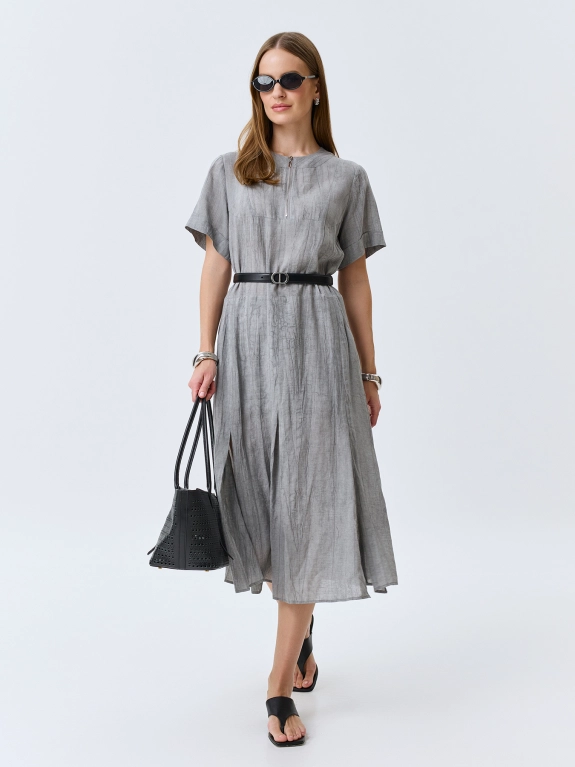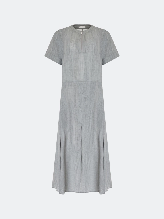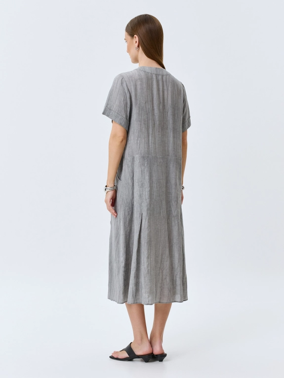 Свободное платье из тенселя и льна. Длина миди. Круглый вырез дополнен молнией. Укороченные широкие втачные рукава. Боковые карманы в швах. Дополнено мягкими складками по низу. Подкладка из 100% хлопка.